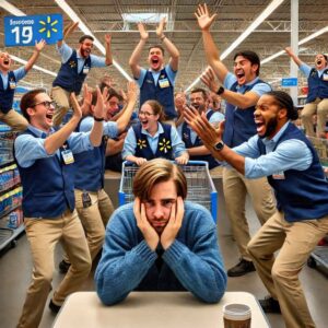 The Scene: A bustling Walmart on a Saturday afternoon. The customer, already feeling a bit sheepish, approaches a young employee who’s clearly just completed his New Employee Orientation. His name tag reads “Trainee Josh,” and he’s trying to put on an air of confidence while clutching his employee manual tighter than a Titanic lifeboat.