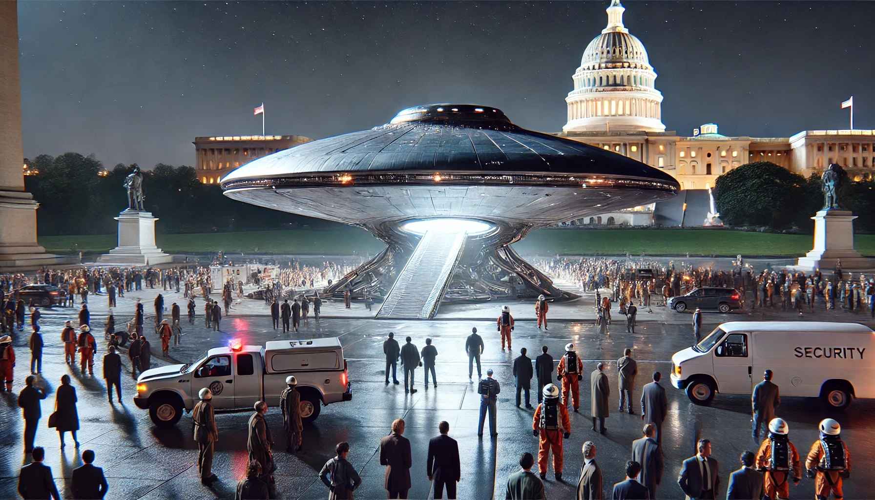 A massive silver spacecraft sits on the National Mall, directly on top of a “No Stopping Anytime” sign. The crowd of onlookers is a mix of tourists, confused government officials, and a hot dog vendor aggressively upselling his “End of the World Special” (a hot dog topped with Ranch Dressing and Crushed Jalapeño Peppers). The hatch of the spaceship hisses open, and a ramp extends downward at an excruciatingly slow speed. The crowd watches in silence as the ramp finally touches the ground.