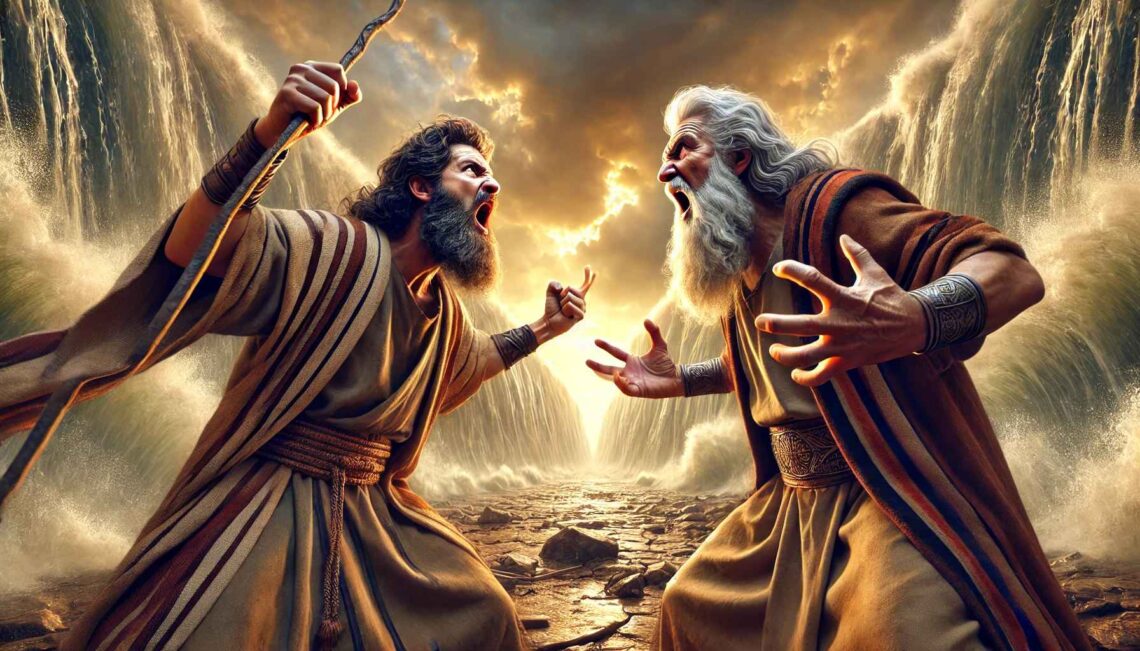 Moses, his beard flowing majestically in the wind (despite the absence of wind), grips his staff and stands before the sea. Aaron nervously flips through a hastily written scroll labeled “Emergency Sea-Parting Instructions.”