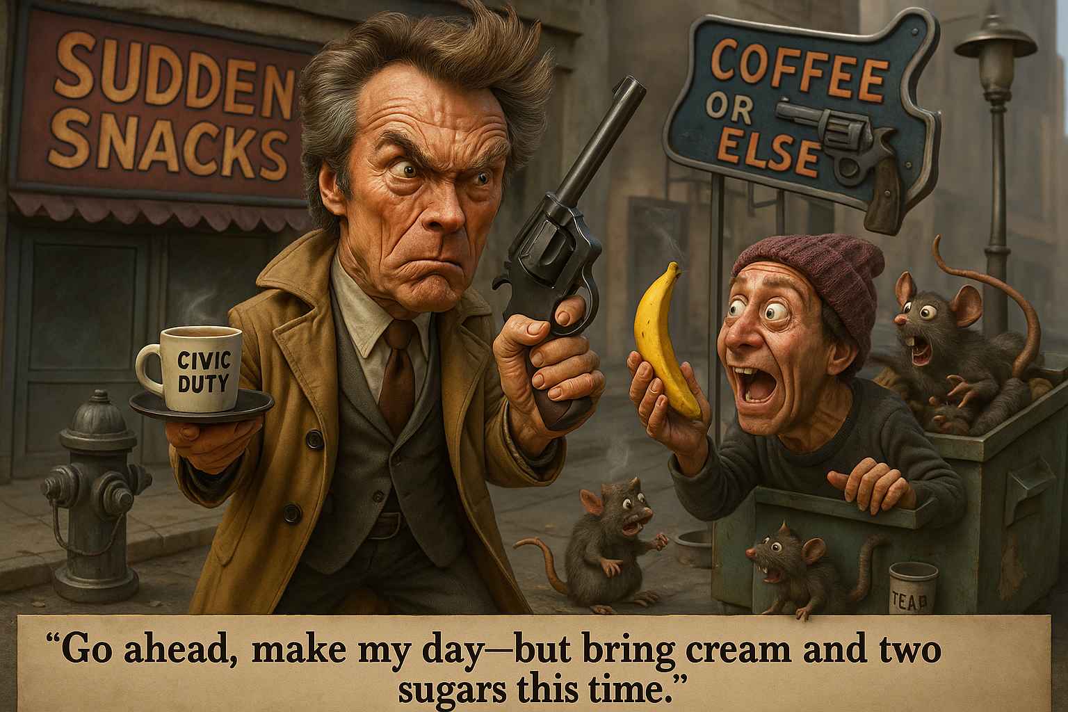 Clint Eastwood, as Dirty Harry, turns this phrase into a threat coiled in grit and gunpowder. It’s less a dare, and more a prelude to someone getting their spleen perforated. You mutter it as your toddler approaches you covered in finger paint wearing a menacing glint of chaotic accomplishment. It’s 8 a.m. and your day has, indeed, been made.