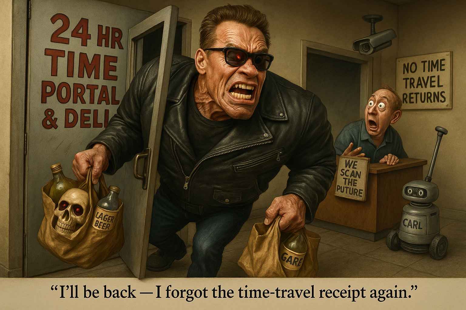Arnold Schwarzenegger’s icy promise isn’t a casual exit. It’s the harbinger of robotic annihilation. Machines are rising, bullets are flying, and yet here he is, politely excusing himself. You whisper it as you leave your office Zoom call, only to return three minutes later when you realized you left your mic on and said something about Carol’s weird haircut.