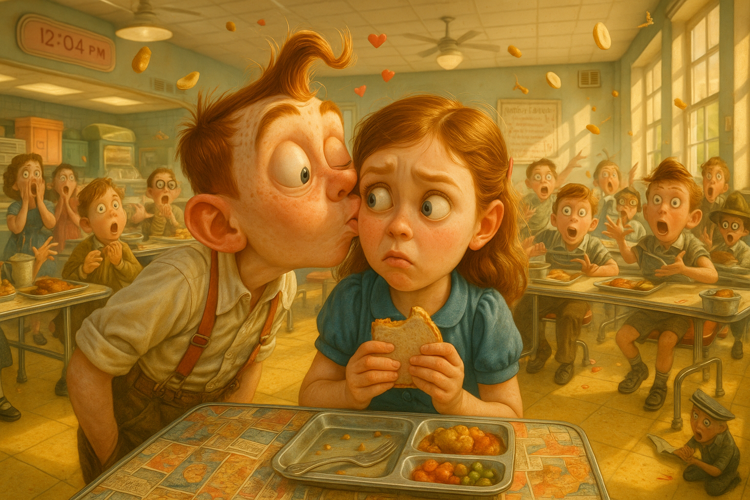 A freckle-faced boy with a cowlick leans in and steals a quick, blushing kiss from the girl who sits in front of him in their fourth grade class