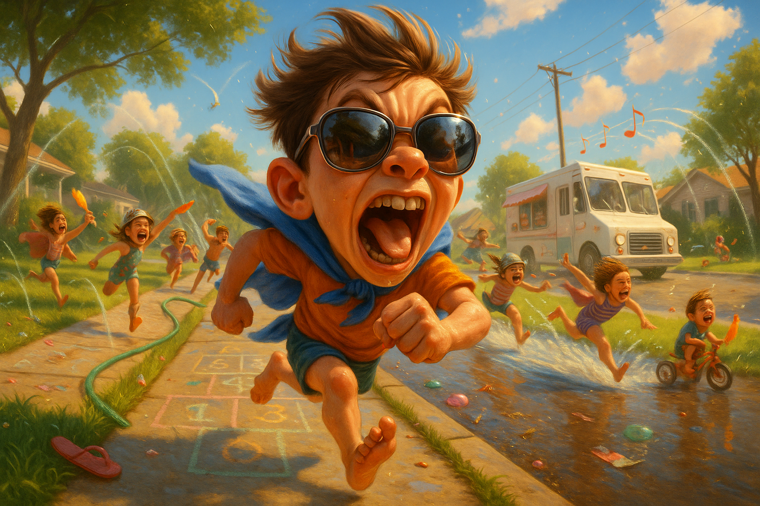Kids playing in the sprinklers hear the faint jingle of the ice cream truck. A barefoot sprint race through the neighborhood ensues.