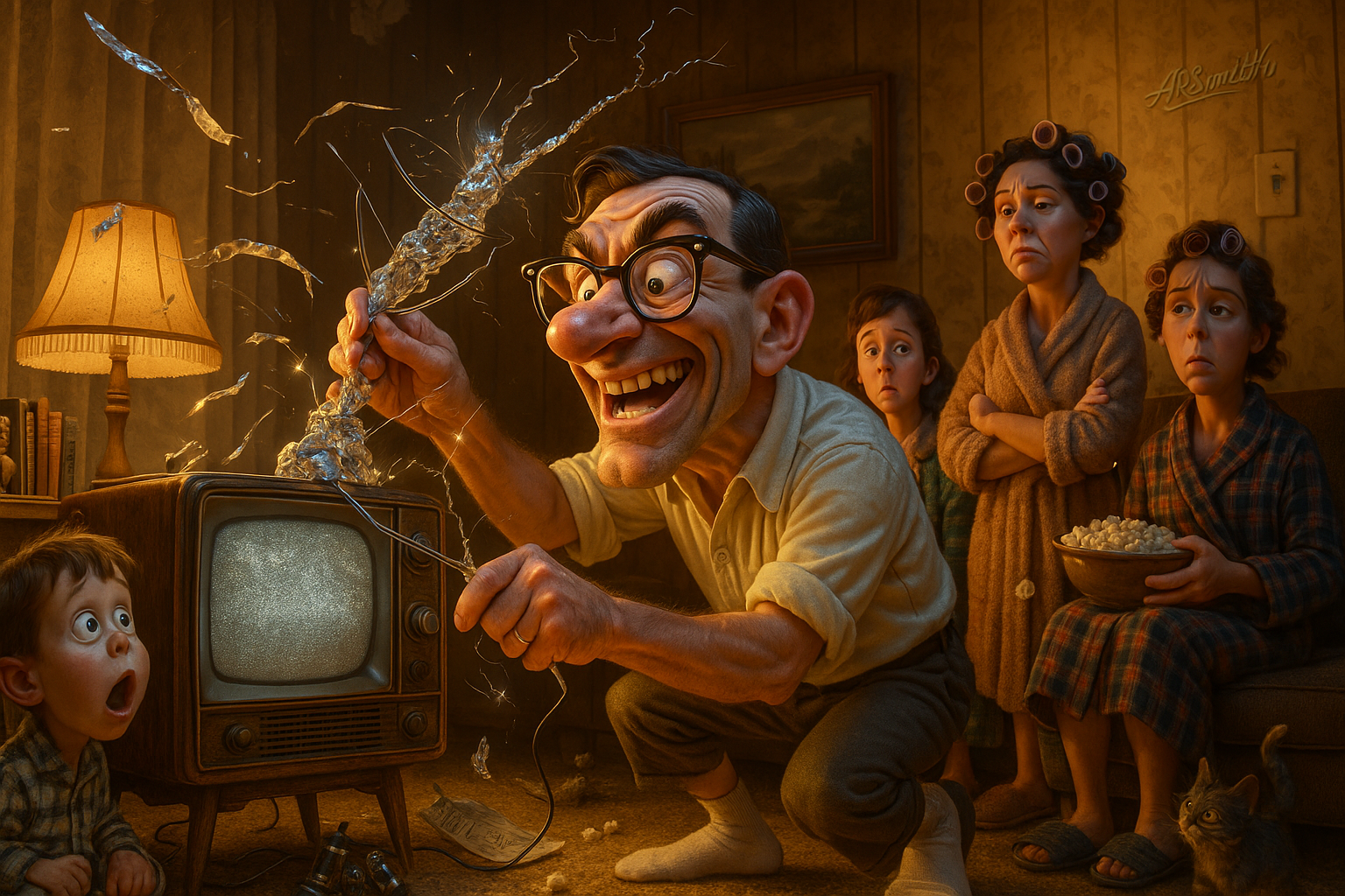 A determined father attempts to fix the “rabbit ears” on the family’s black-and-white TV by wrapping them in aluminum foil.