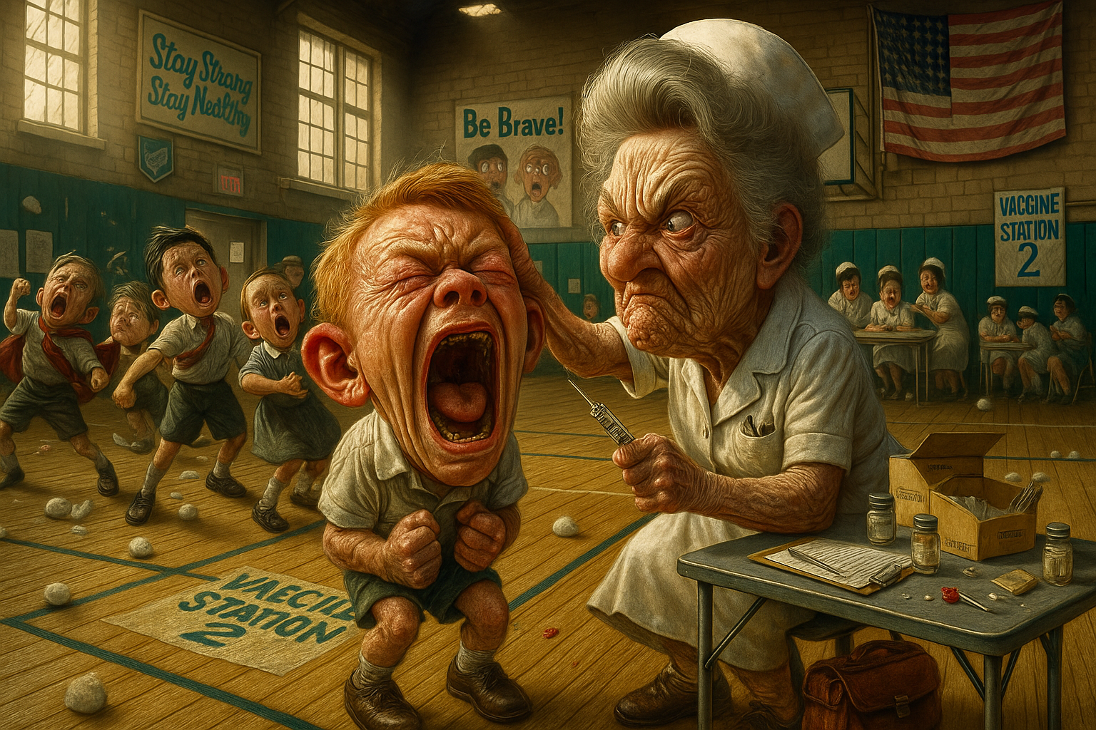 In the school gym, kids line up for their polio vaccines. One boy screams preemptively before the nurse even touches him.