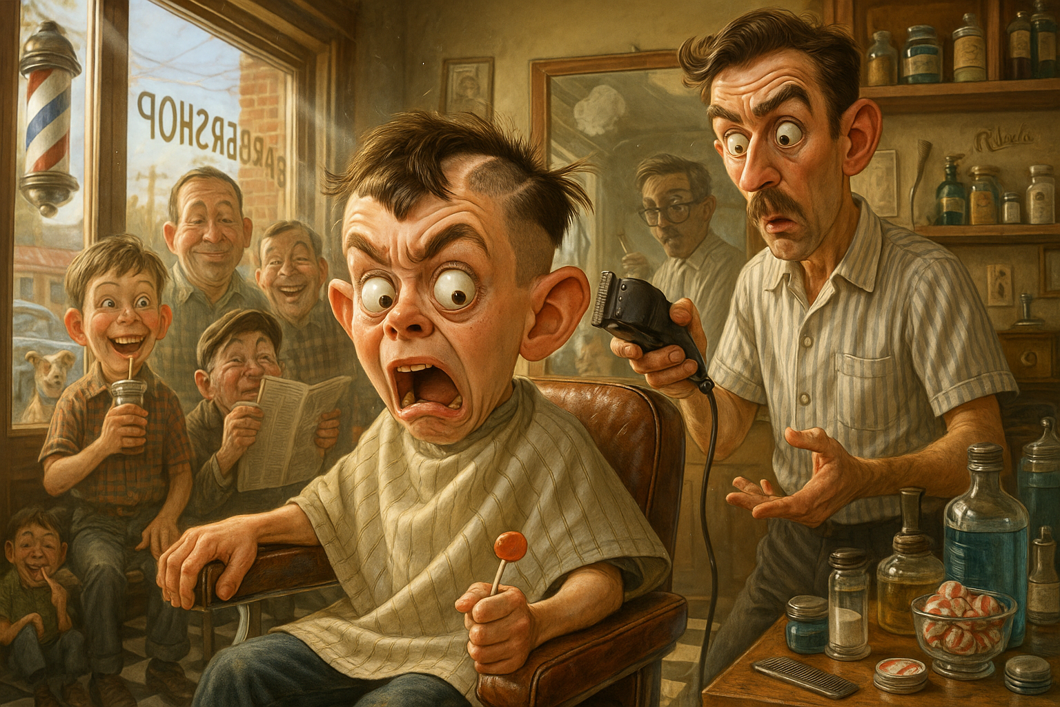 At the barbershop, a jittery boy fidgets so much he ends up with an accidental shaved-clean side that becomes his signature look for the second grade.