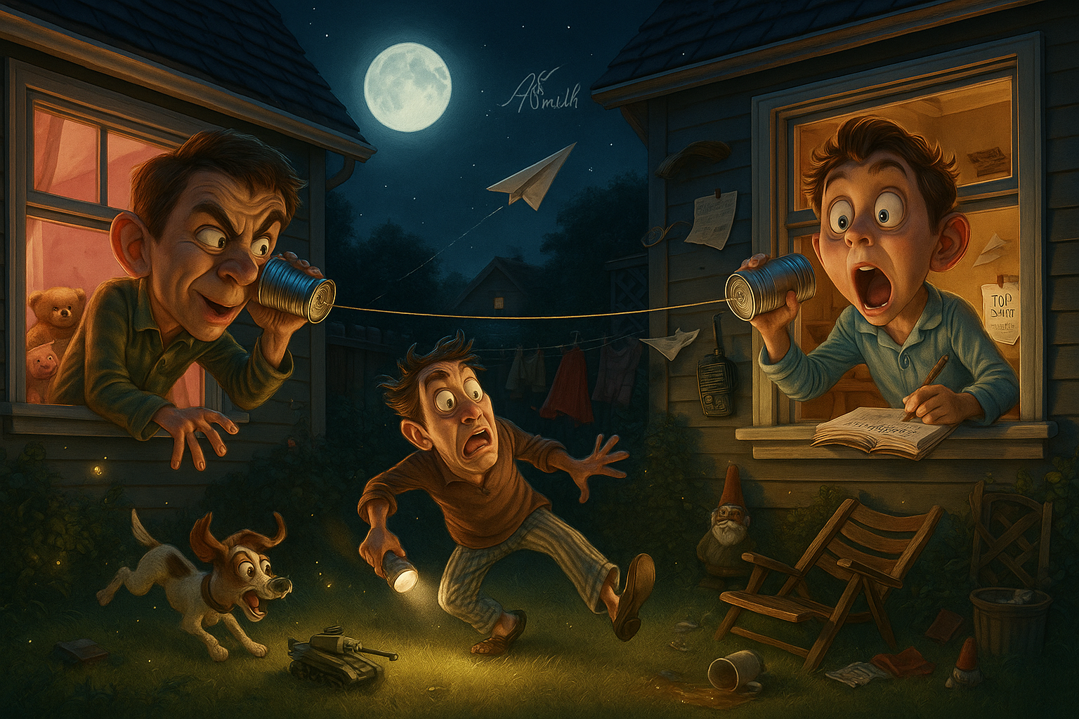 Two best friends run a string from their bedroom windows across the backyard and whisper classified gossip into their tin-can phones until one’s dad trips over the string and breaks the connection.
