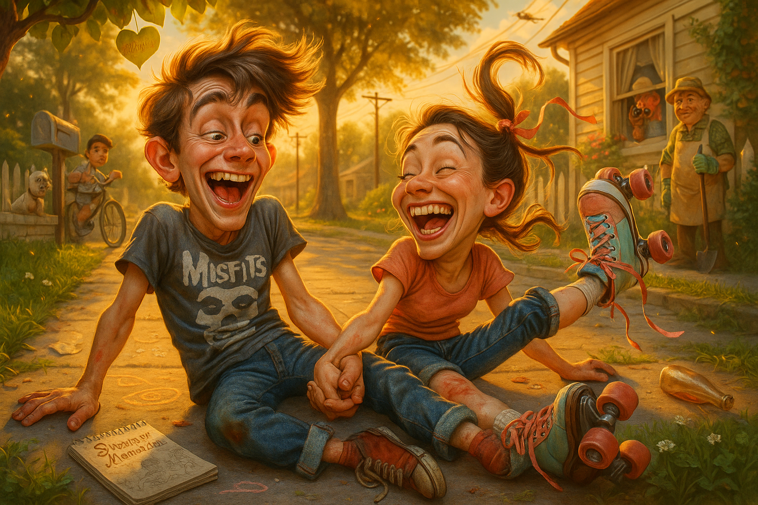A teenage boy offers his hand to help a girl stay steady on her new roller skates, only for her to pull him down instead. They laugh from the sidewalk for ten full minutes.