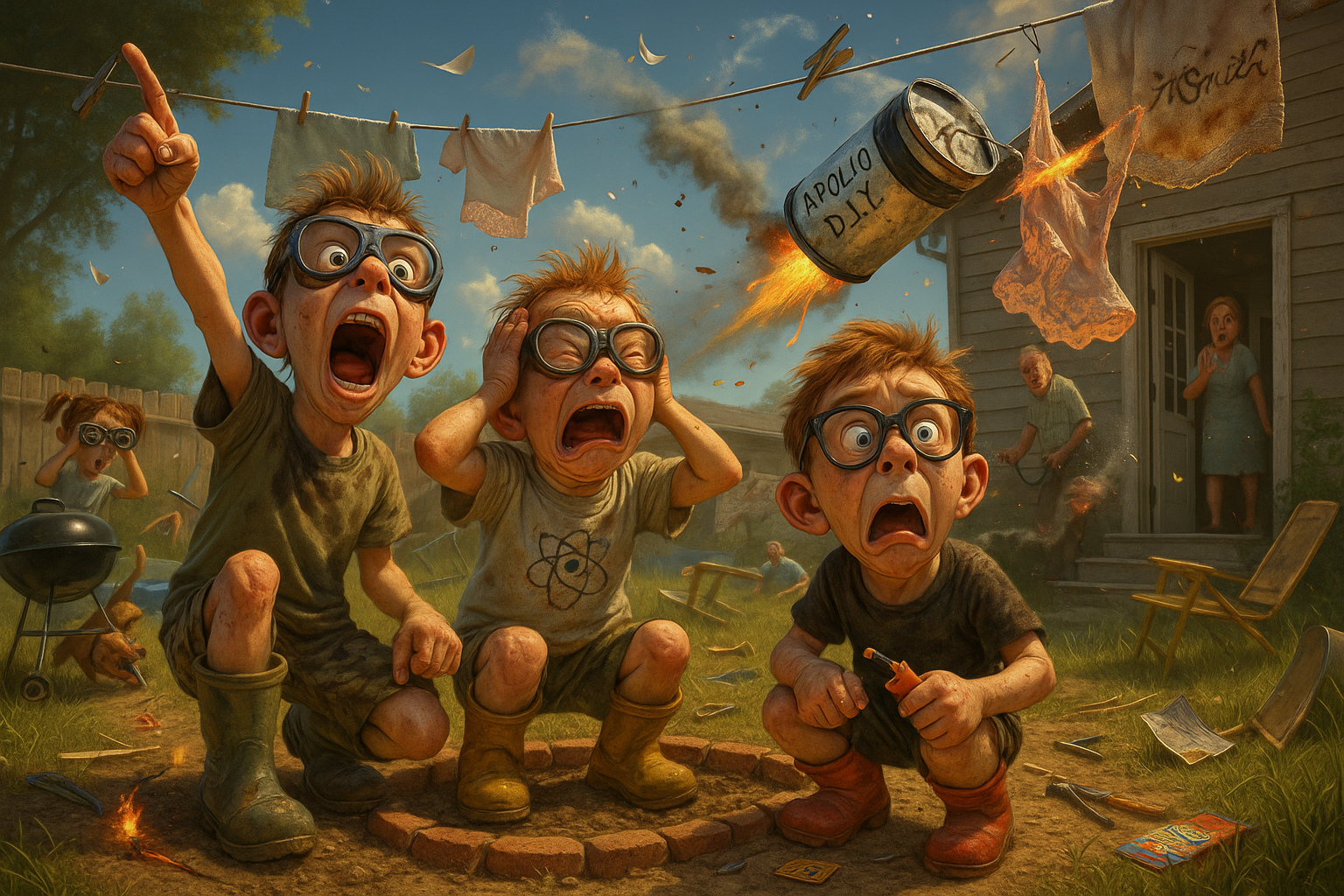 Three boys build a working rocket out of a coffee can, a lighter, and an entire pack of sparklers. It launches six feet, hits the clothesline, and sets Mom’s new slip on fire.