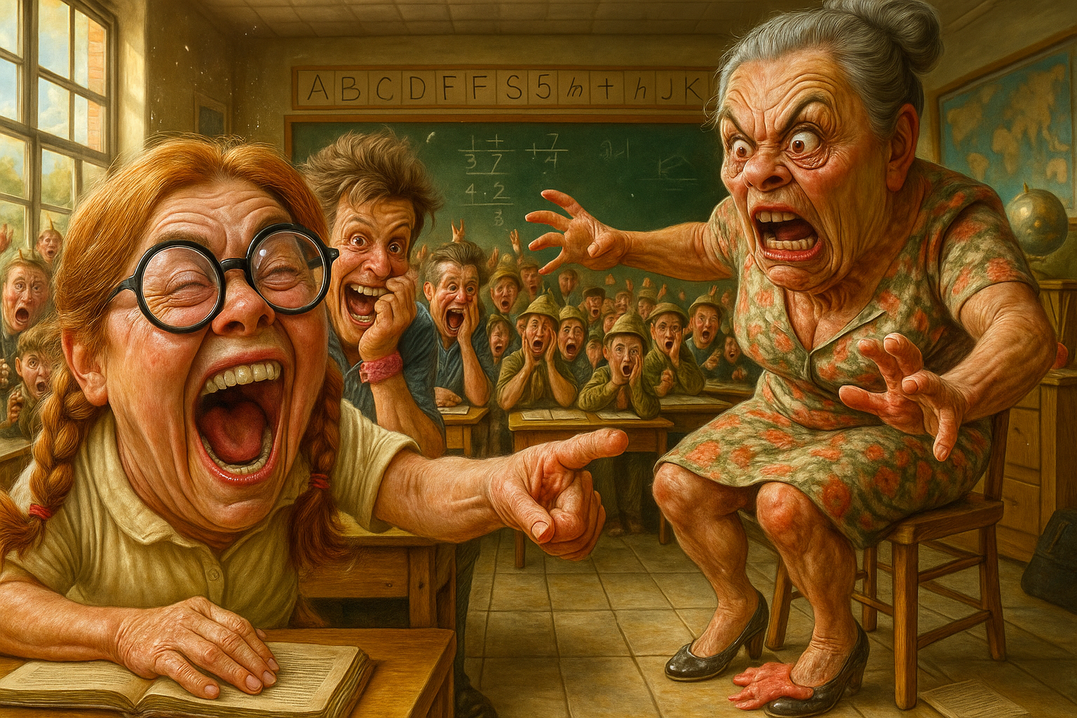 Create this picture in 8k ultra photorealism style using Hyperrealistic, exaggerated caricature. In a comical portrait-style setting, maintaining the layout and composition of the original image, melodramatic, overly large, intense and intricate facial expression with lots and lots of movement by all the characters, animation, and physical activity. The image should capture as much facial-specific details and coloring as in the original reference image as possible.