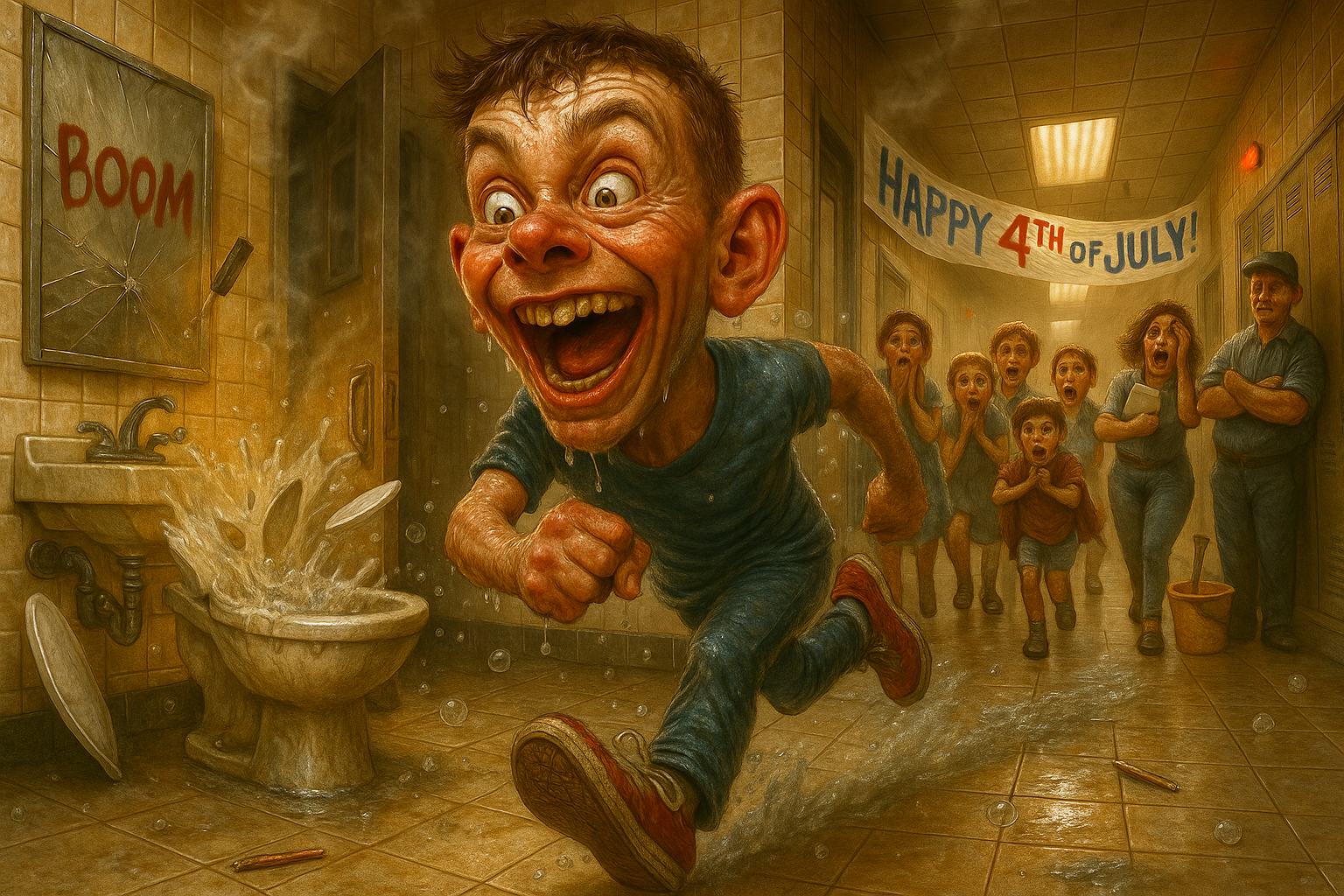 A boy sneaks a leftover Fourth of July firecracker into the school bathroom, drops it in a toilet, lights it, and runs, resulting in a destroyed bowl, and a very wet hallway.