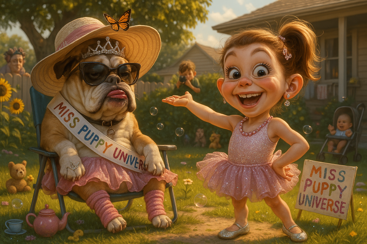 A girl turns her neighbor’s grumpy bulldog into a beauty queen using Mom’s lipstick, a Sunday hat, and her own ballet tutu.
