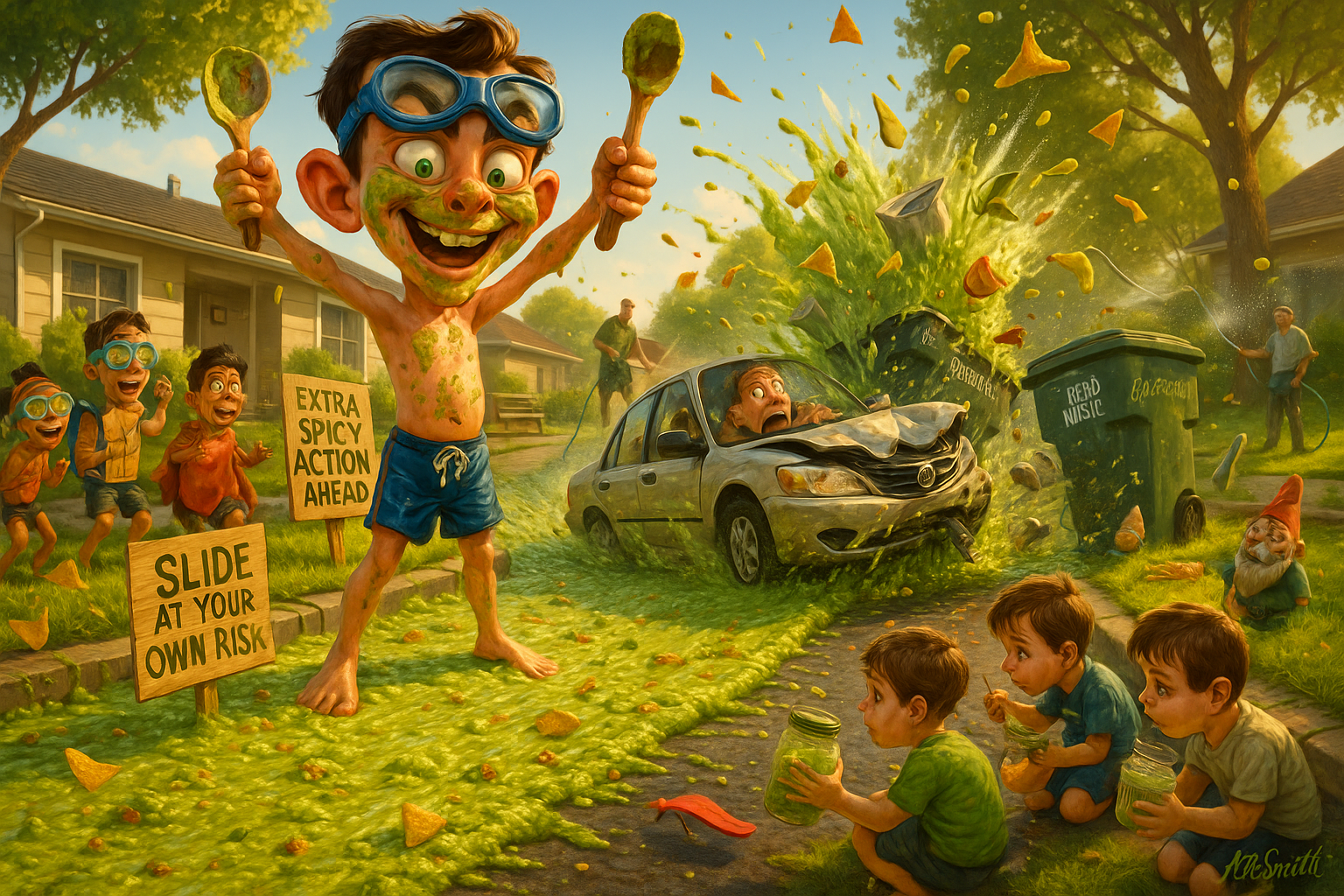 An inventive boy coats the driveway in guacamole for the most fun slide ever. It’s fun until Dad pulls in early from work and slides into the garbage cans.