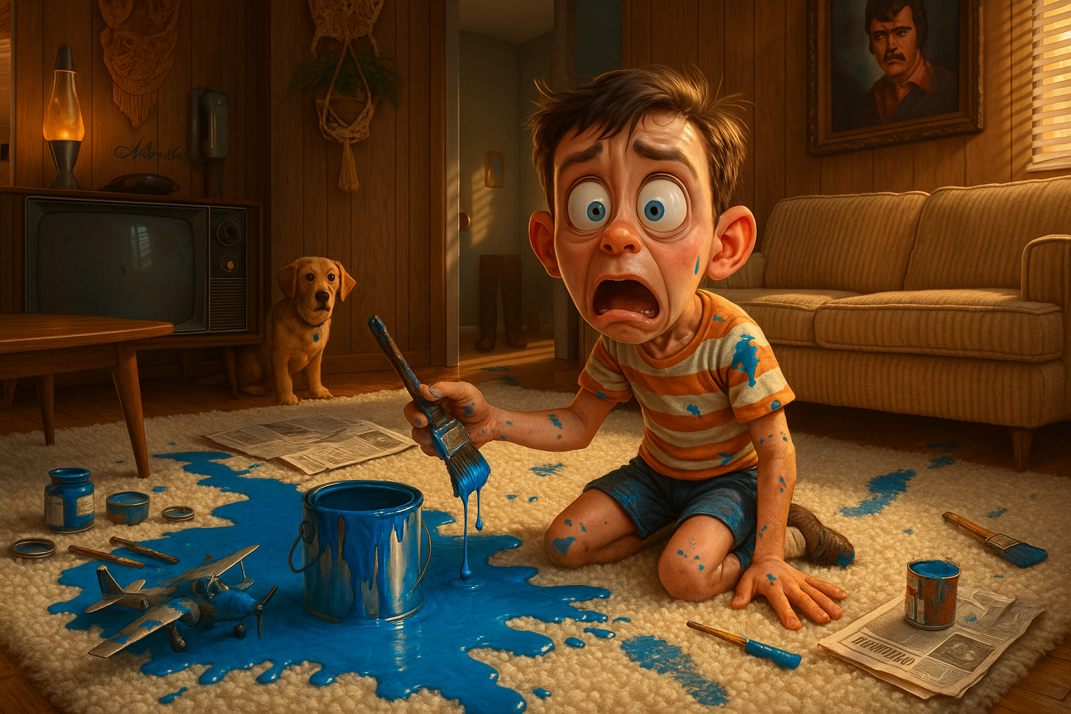 While trying to repaint his model airplane, a boy accidentally knocks over the entire can of bright blue enamel paint onto the living room white shag carpet.