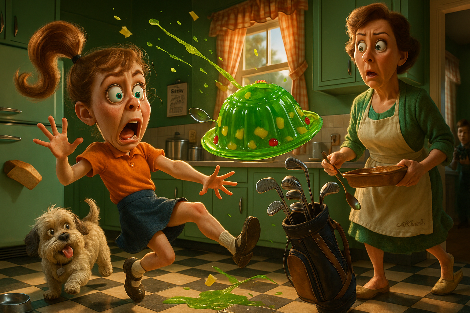 A girl surprises her mom when she trips over the dog while holding onto a large lime Jell-O mold. On the way to the fridge, she launching it across the kitchen like a frisbee. It lands upside down into Dad’s golf bag.
