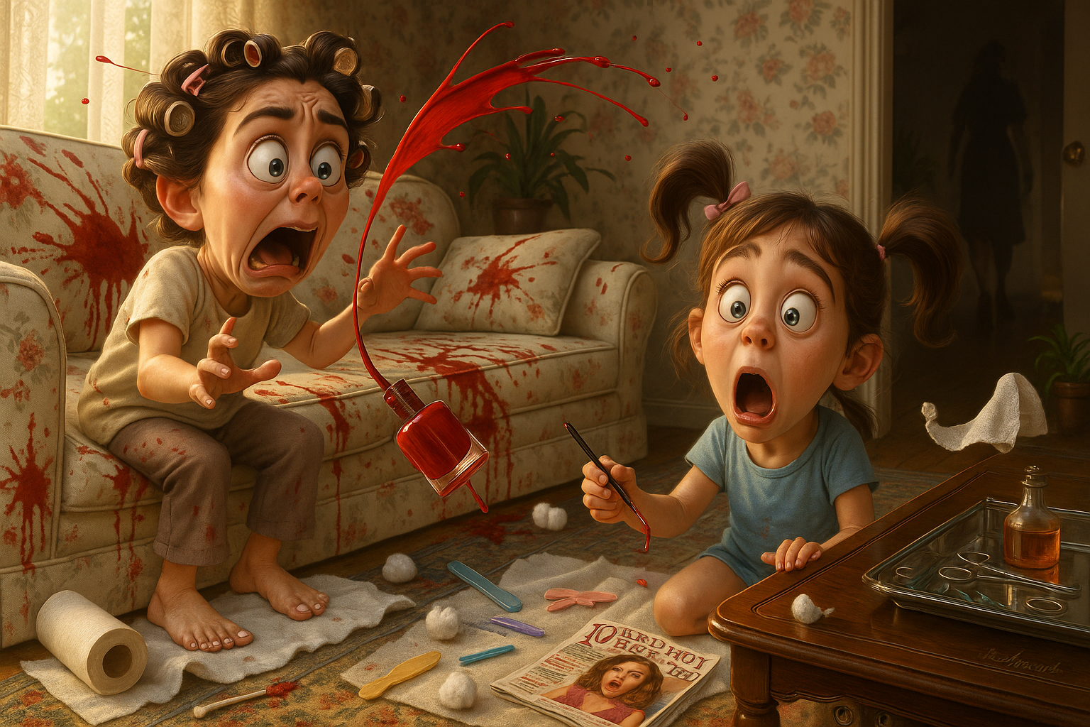 Two sisters play beauty salon using Mom’s favorite blood-red nail polish. One bump sends the bottle toppling, splattering the pristine white sofa with something that looks like it’s straight out of a crime scene.