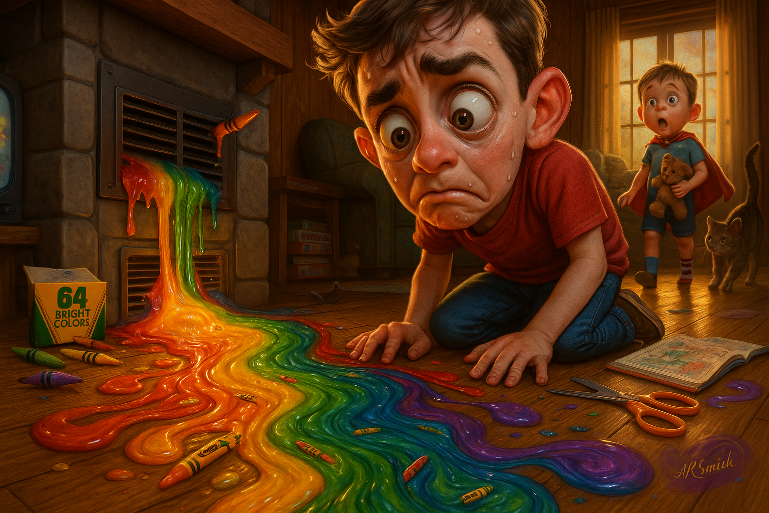 A boy hides crayons in the heating vent to keep them safe from his little brother. They melt into a waxy, rainbow-colored lava flow that leaks out and fuses with the hardwood floors.