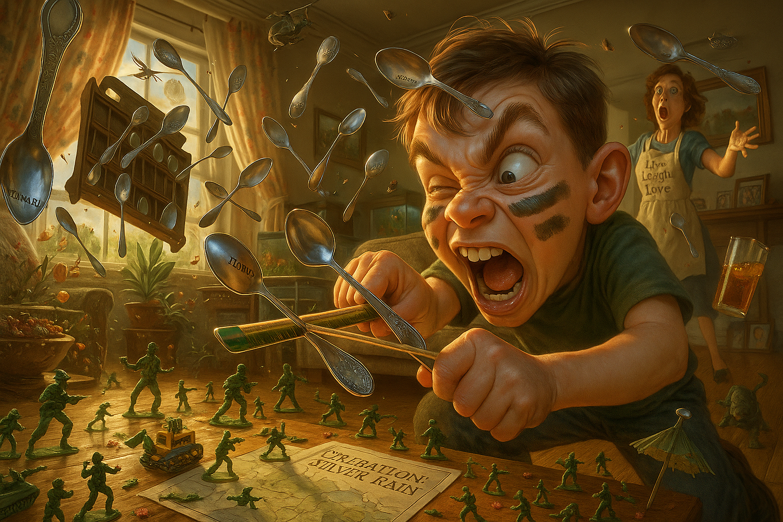 A boy turns Mom’s decorative souvenir spoon collection into missile launchers for his army of men. The whole rack comes crashing down in a metallic avalanche.