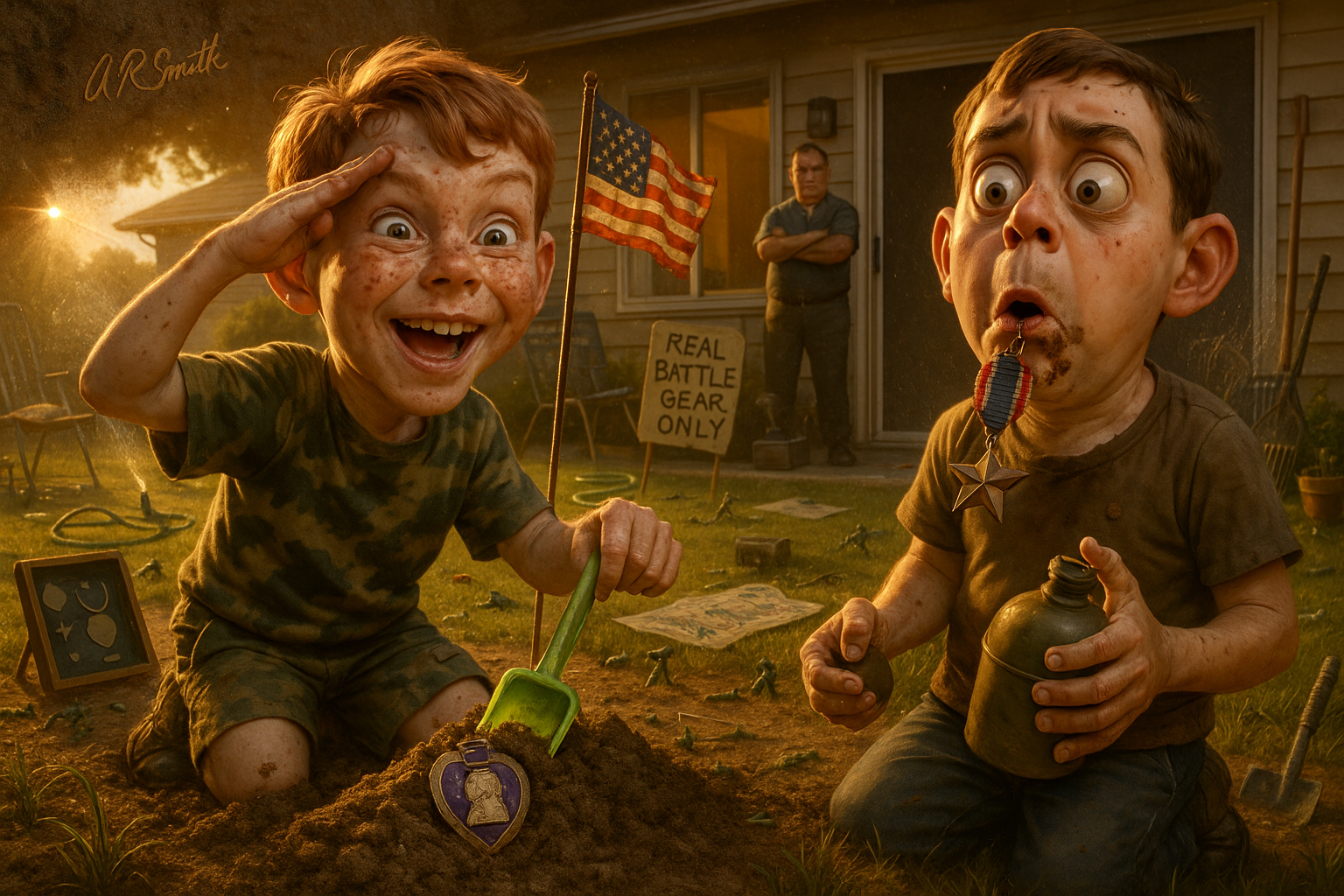 Two kids dig into Dad’s shadow box of World War II medals to play real soldiers. The Purple Heart gets buried in the backyard. The Bronze Star is mistaken for chocolate and eaten.