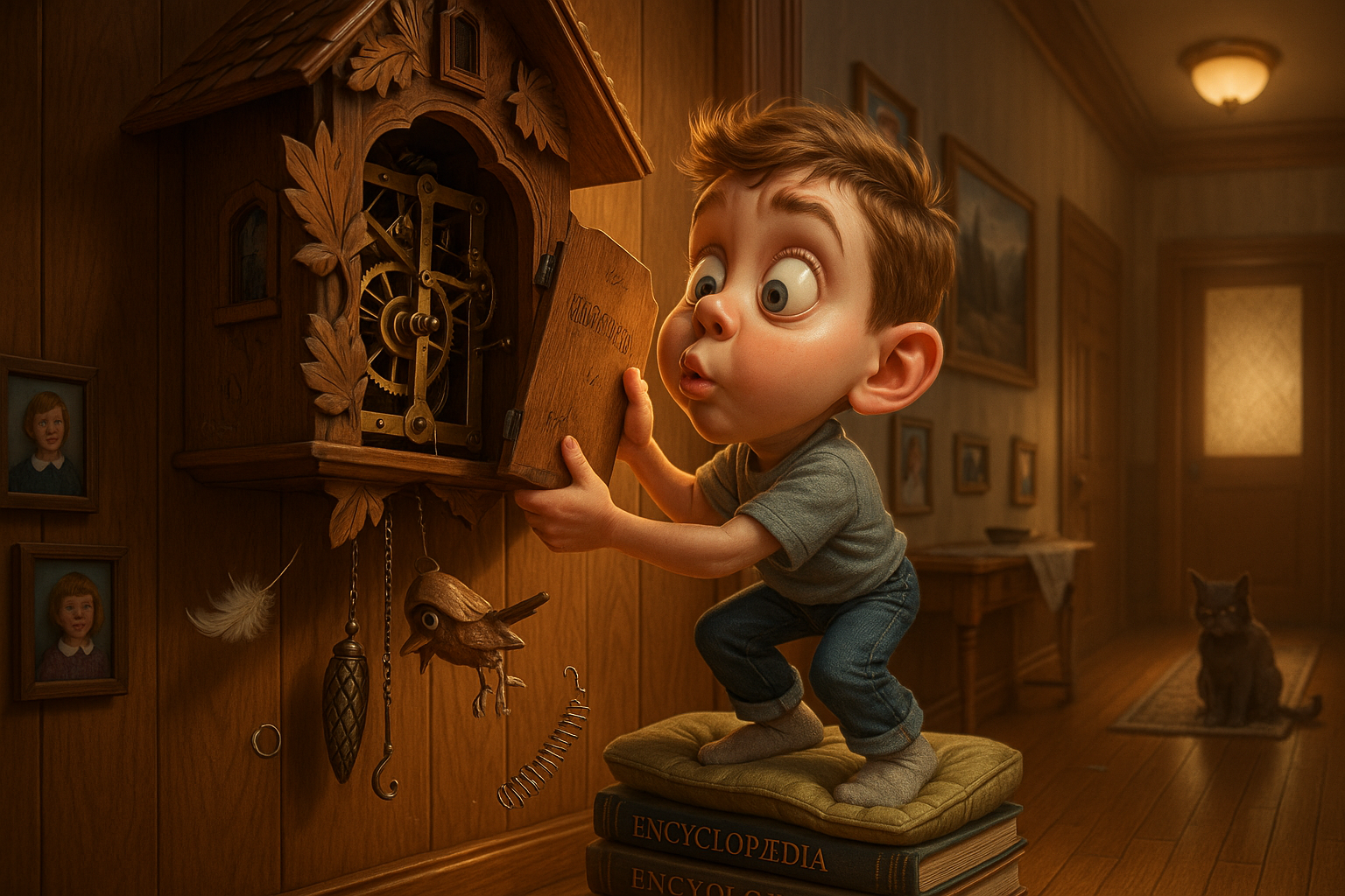 Fascinated by the little wooden bird, a boy opens the back of the family’s German cuckoo clock to see where the bird sleeps.