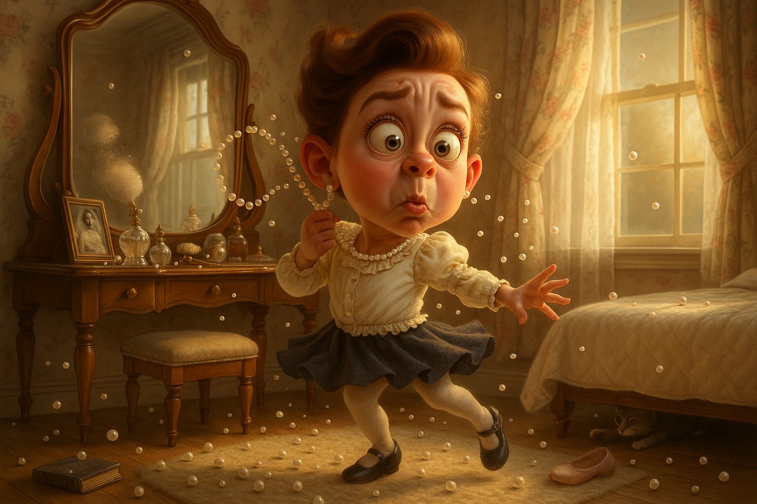A girl sneaks into her mother’s vanity to try on her wedding pearls before her school picture. The clasp snaps mid-pirouette, sending pearls bouncing like lottery balls.