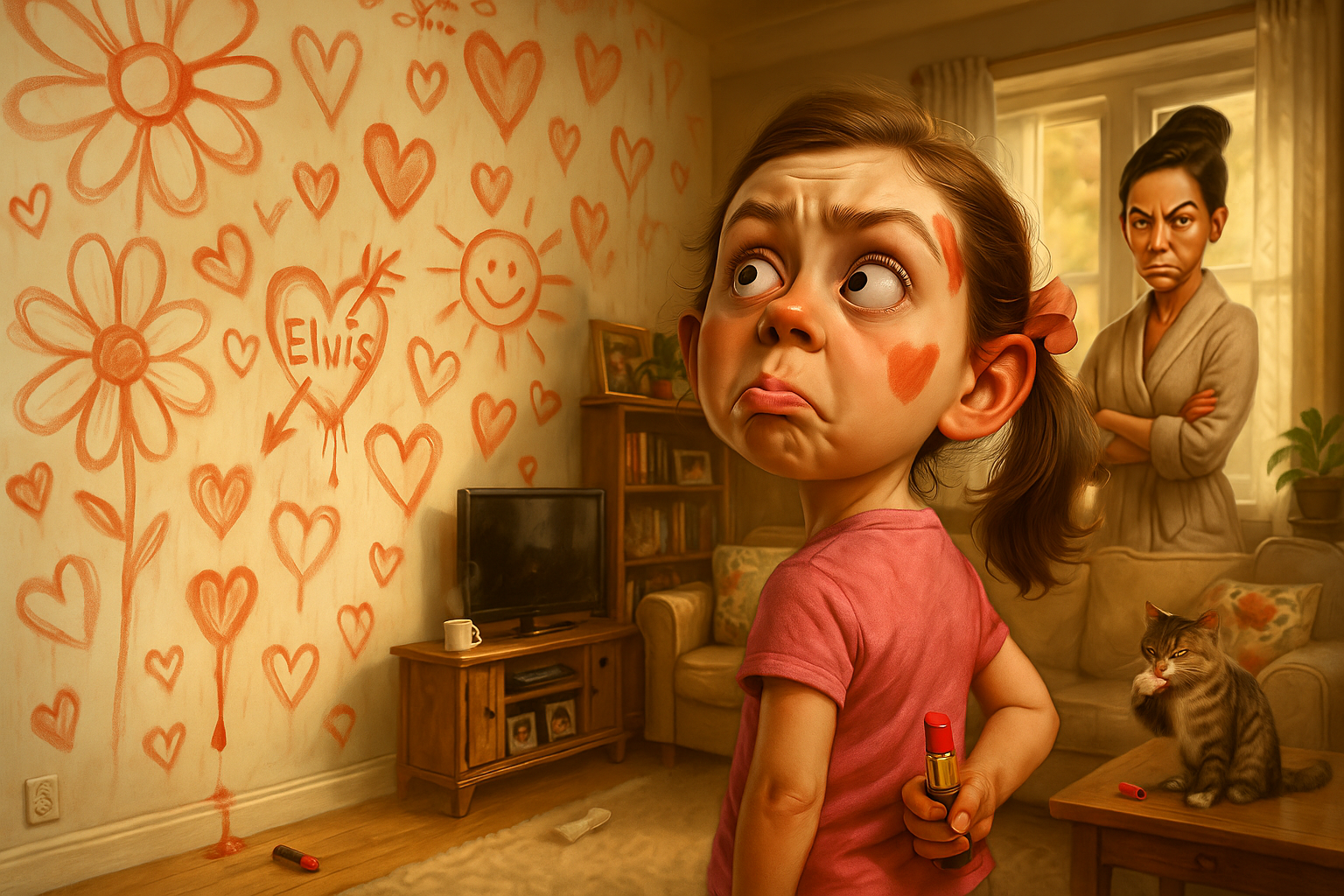 A girl scrawls flowers, hearts, and her crush’s initials across the living room wall using her mom’s bright coral lipstick. When questioned, she says, “I think it was a burglar.”