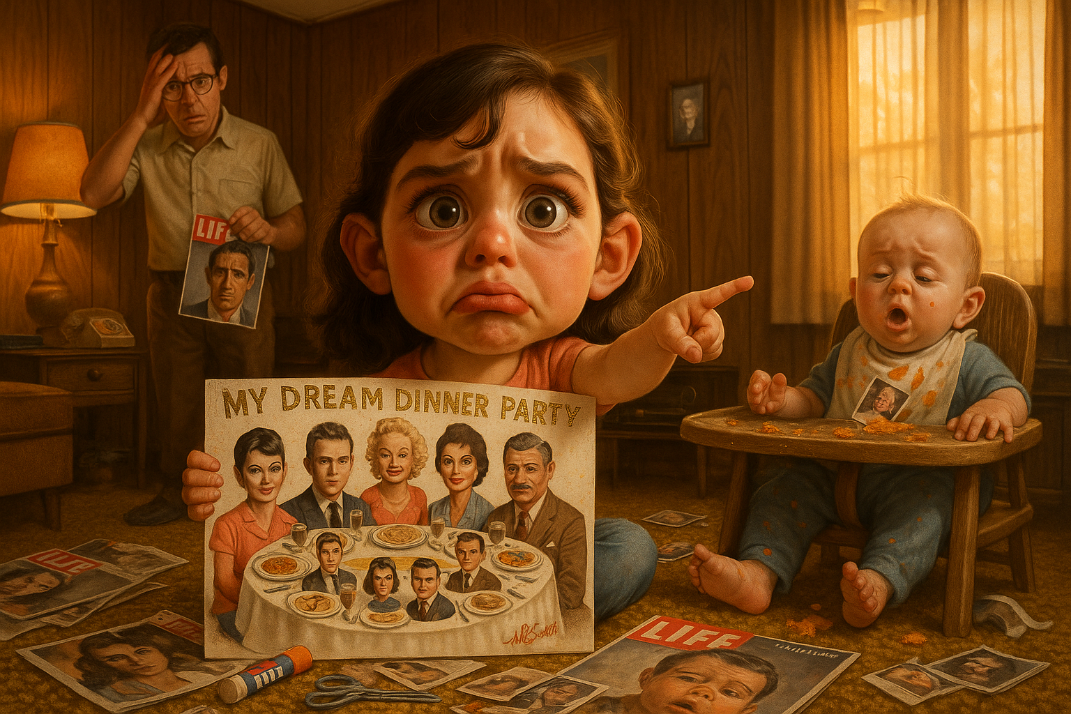 A young girl cuts out movie star faces from her dad’s prized collection of Life magazines for her dream dinner party collage. When confronted, she pouts and points directly at her one-year-old baby brother.
