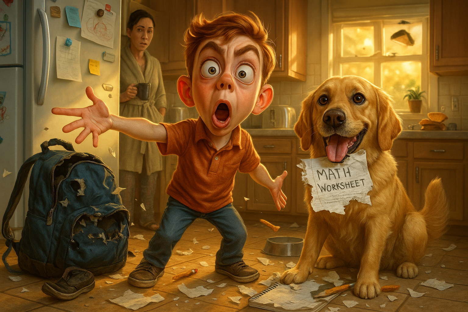 A boy claims the dog ate his homework.