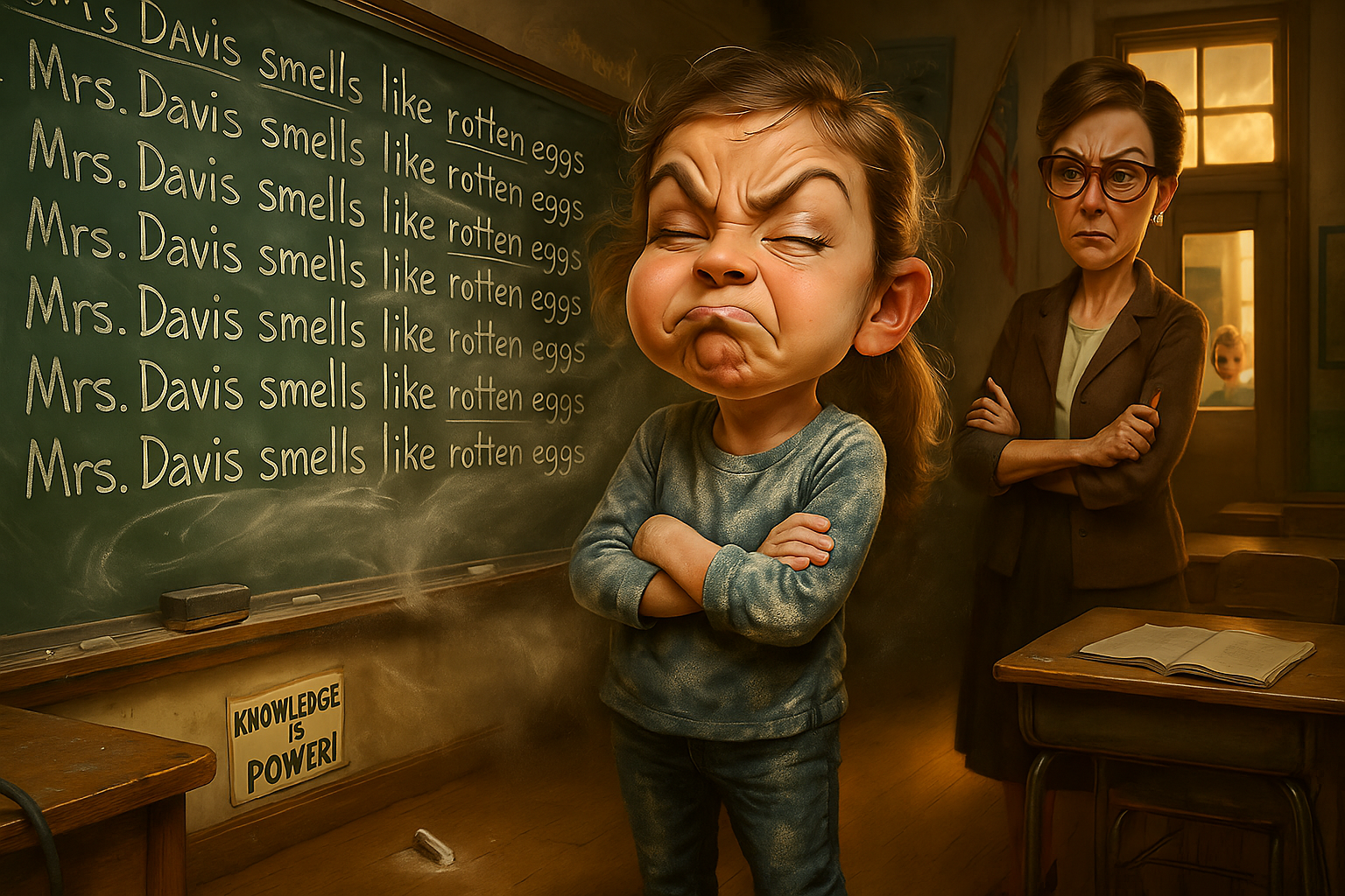 A girl is sentenced to detention after school. To get even, she writes “Mrs. Davis smells like rotten eggs” 100 times on the chalkboard. When confronted, she insists it wasn’t her, while standing in a cloud of chalk dust visible on her face and clothes.