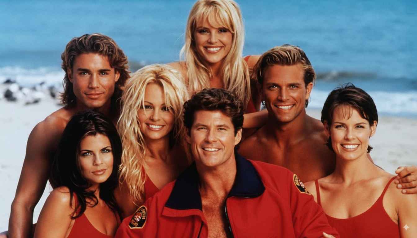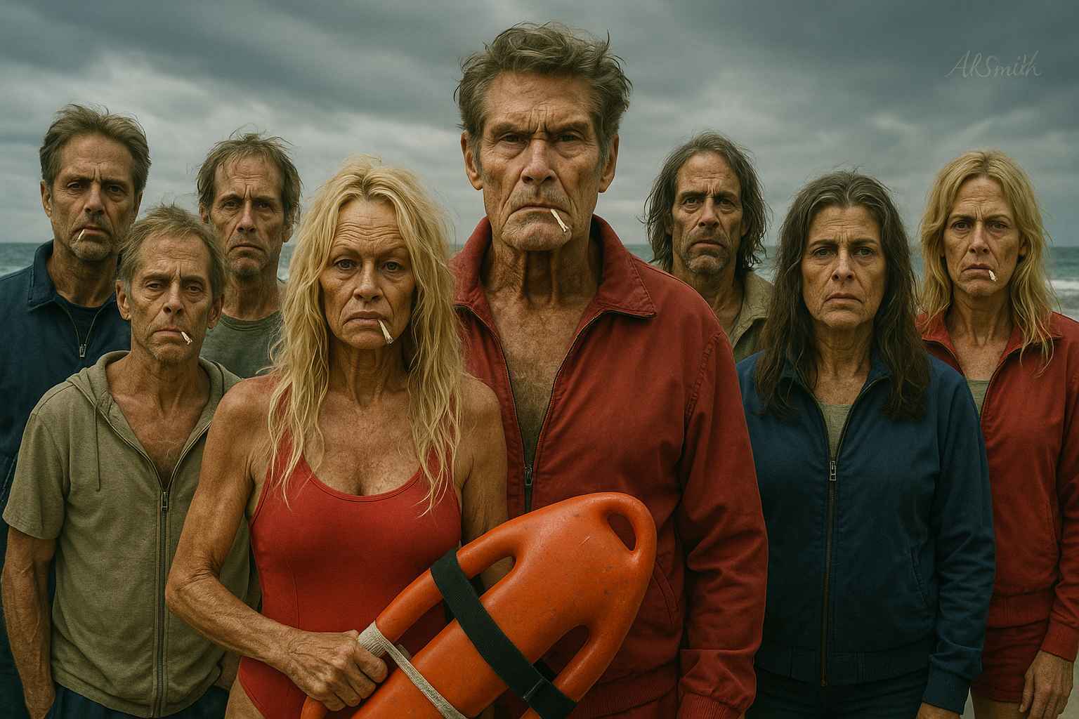 “Baywatch” once defined sun-kissed escapism, all bronzed bodies sprinting in slow motion to the soundtrack of ’90s excess. It was lifeguards, glamour, and glossy fantasy on Southern California’s beaches, exporting an eternal summer around the globe. Decades later, the fantasy curdled—its cast aged into weathered relics, faces gaunt, hair tangled, eyes tired from too many parties and too many mornings-after. Yet here they stand, fifty years on, still clutching orange rescue cans, cigarettes dangling, willing to strike a pose for a sequel no one asked for. Now, the show is less a celebration of youth than a stark portrait of survival: wrinkles, grit, and faded charisma etched into every frame. “Baywatch” is remembered not just for running in red swimsuits, but for proving that pop culture icons never drown—they wash back ashore, storm clouds overhead, older, haggard, yet somehow unbroken.