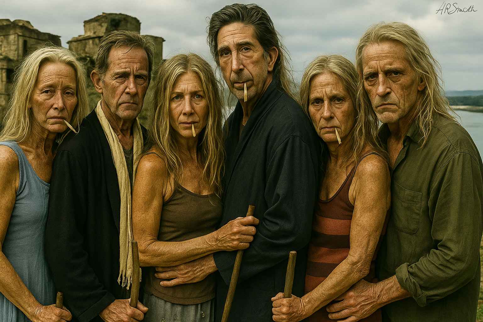 “Friends” once embodied the glossy charm of 1990s New York, where six companions navigated love, work, and endless coffee in Greenwich Village. It was bright, funny, and impossibly hopeful, a sitcom fantasy that became a cultural landmark. But after decades of fame and syndication, the dream soured. Money and gossip wore thin, and the group abandoned Manhattan for a remote meditation center along the Ganges in Bangladesh. Now wrinkled, weary, and weathered, their faces etched with exhaustion, they stand in silence, cigarettes drooping, eyes carrying more burden than banter. The once-vibrant bonds of “Central Perk” have given way to austere resilience, every wrinkle a testament to survival. “Friends” lingers today as both nostalgic comfort and ironic epilogue: proof that even the most celebrated sitcom family may one day seek quiet oblivion far from the laughter that first made them immortal.