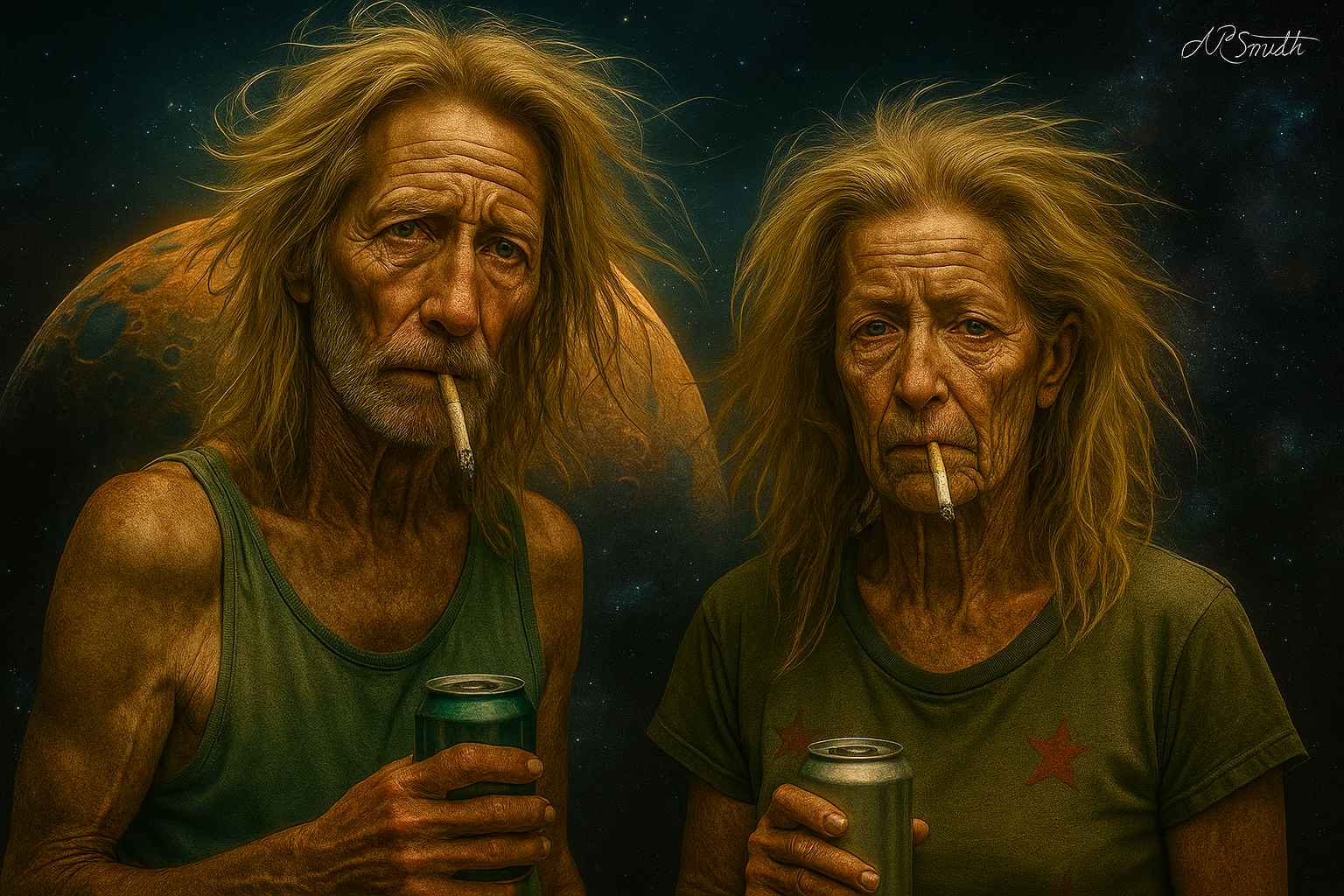 “The X-Files” once thrived on mystery and paranoia, following Agents Mulder and Scully through shadowy conspiracies and alien abductions that defined a generation’s fears. It was sharp, eerie, and unrelenting, cementing its place as a cult phenomenon. But in this imagined aftermath, the truth is stranger still—abducted one final time, Mulder and Scully find themselves stranded on Xerathis Prime, forced into a trailer park existence under alien skies. Dressed in ragged hand-me-downs, faces gaunt and weathered, they cling to resilience, gripping the trinkets of survival rather than weapons of investigation. Cigarettes—or whatever substitutes the aliens provide—droop from tired mouths, their once-fiery eyes dulled but unbroken. The grandeur of government secrets has eroded into the grit of daily survival, their legend reframed as cosmic irony. Today, “The X-Files” endures as both cultural artifact and cautionary tale: sometimes the truth isn’t out there—it’s whatever scraps keep you alive.