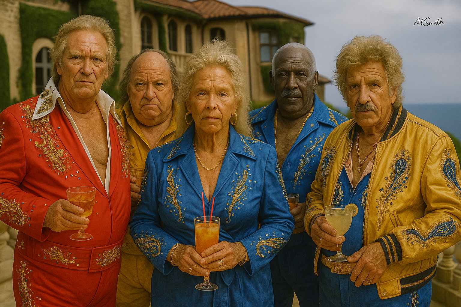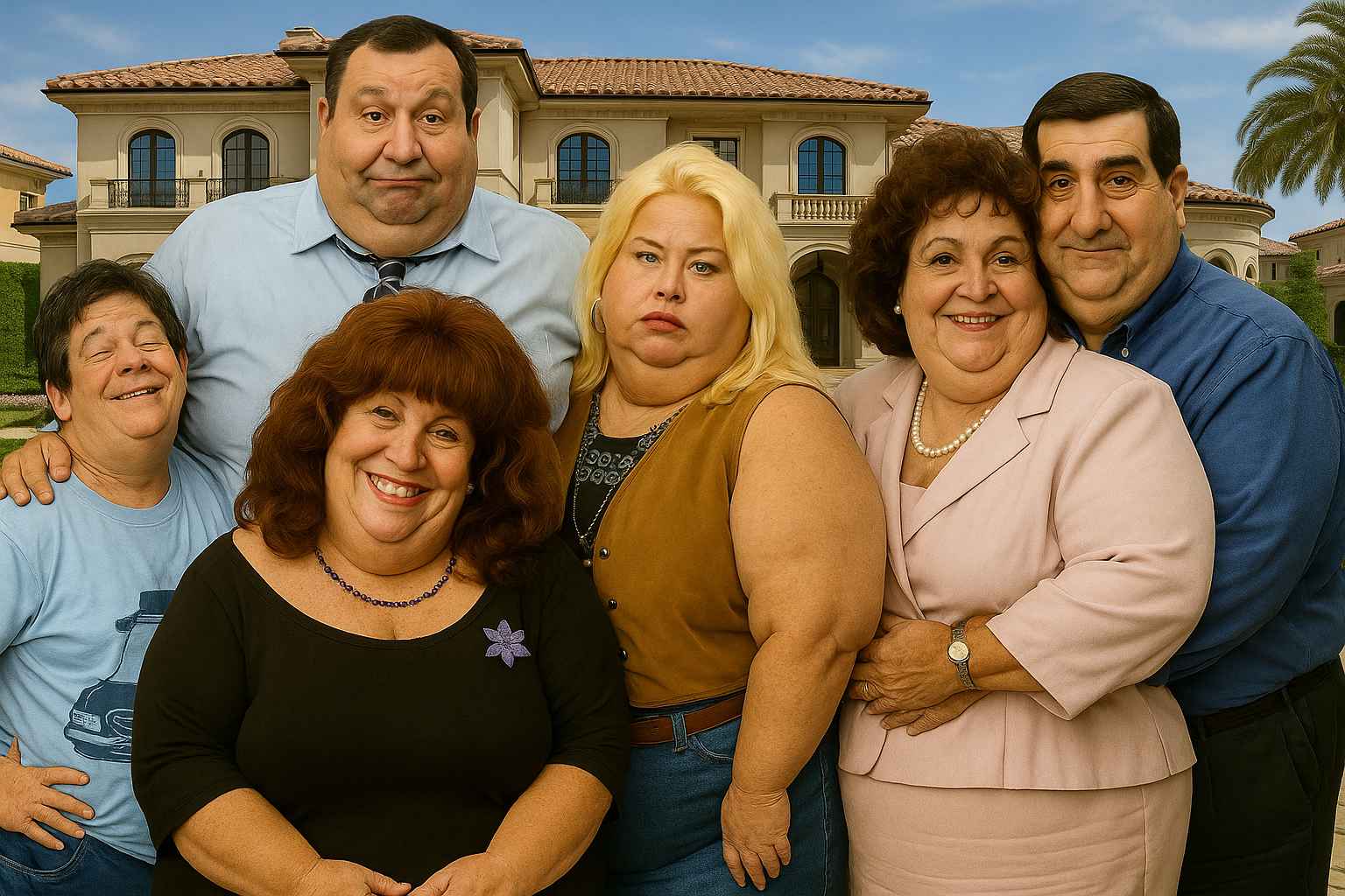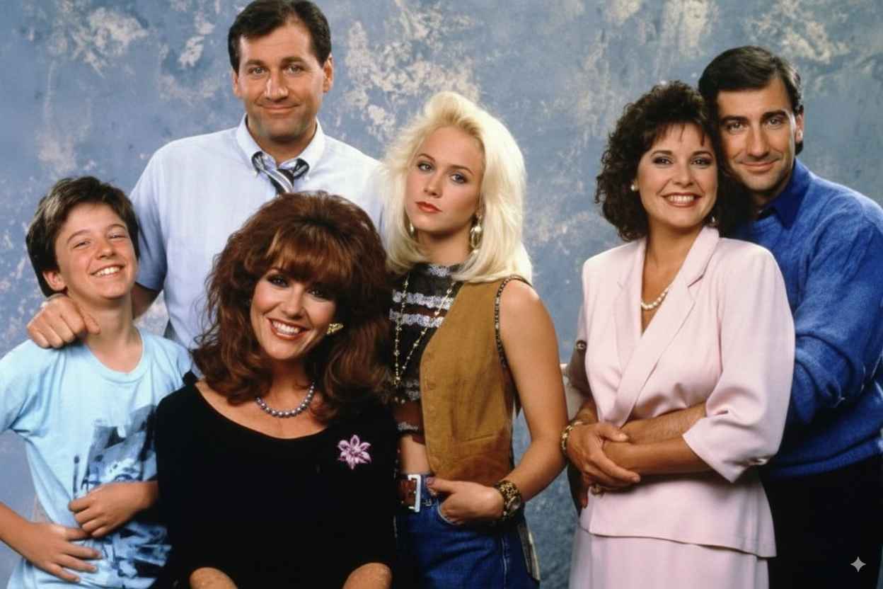 “Married… with Children” once thrived on suburban dysfunction, following Al Bundy’s bitter quips, Peggy’s lazy glamour, and the kids’ chaotic antics in a dingy Chicago home. For a decade, it was television’s brashest satire of family life, gleefully mocking the American Dream. In this imagined twist of fate, Al’s shoe business inexplicably soared, catapulting the Bundys and their neighbors into Beverly Hills excess. Now opulent, weary, and sun-bleached, they pose before a sprawling mansion off Rodeo Drive, hands clutching the spoils of gaudy wealth. Their faces show exhaustion more than triumph, their eyes tired but unbowed, as though fortune came too late to erase the scars of struggle. What was once a chronicle of sarcastic poverty has become a parody of success—still absurd, still biting, but dressed in the glittering trappings of a life they never dreamed they’d own.
