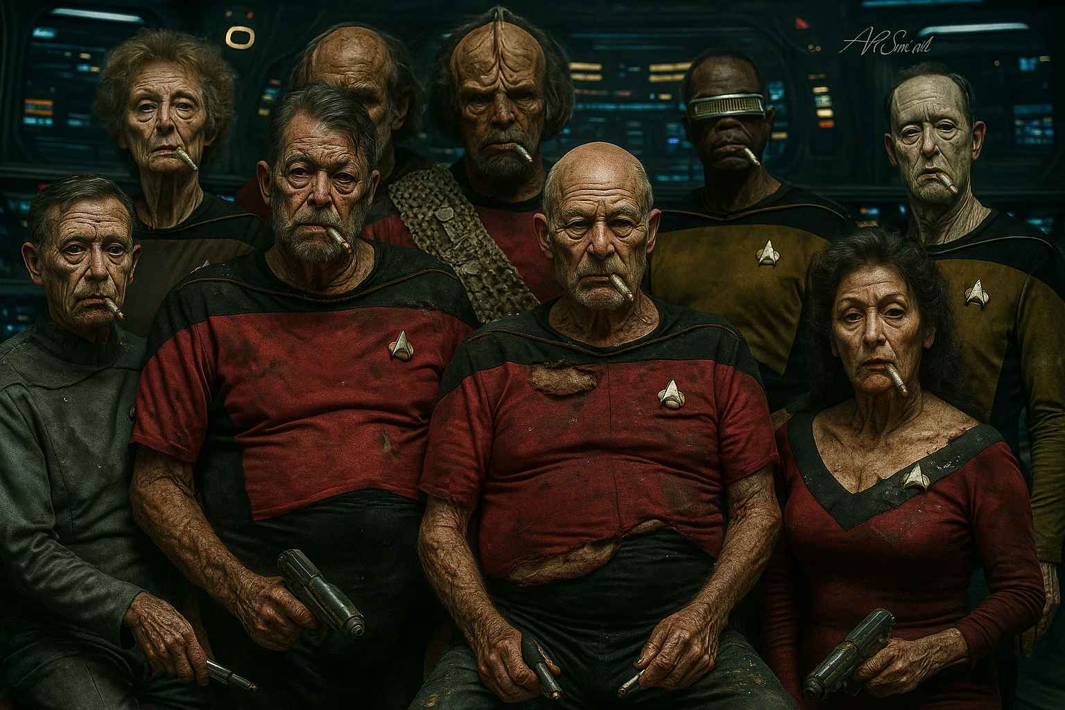 “Star Trek: The Next Generation” once carried viewers boldly into the future, its crew symbols of intellect, diplomacy, and discovery. For seven seasons, Picard’s calm authority, Riker’s charm, and Data’s quest for humanity anchored a universe of possibility. Decades later, the fantasy collides with reality: the cast, older and heavier, squeeze into costumes now frayed and filthy, seams splitting as they attempt a read-through for a long-delayed sequel. On a cyberpunk-styled bridge, their weary faces show every wrinkle and scar of time passed, cigarettes drooping, hands gripping antiquated props that feel heavier than before. The optimism of warp speed and new frontiers has given way to gritty endurance, each expression a mixture of exhaustion and resilience. What was once sleek and visionary now looks patched and fragile, yet the spirit of the Enterprise lingers—proof that even aging explorers can still attempt to chart one more uncertain course among the stars.
