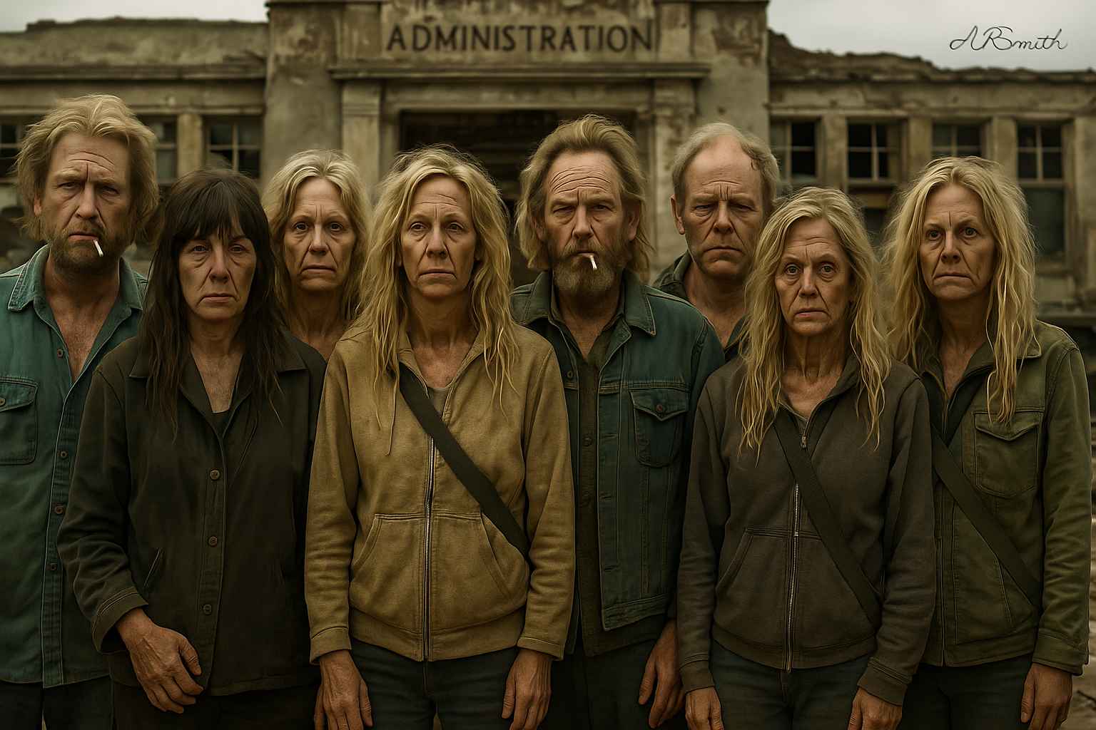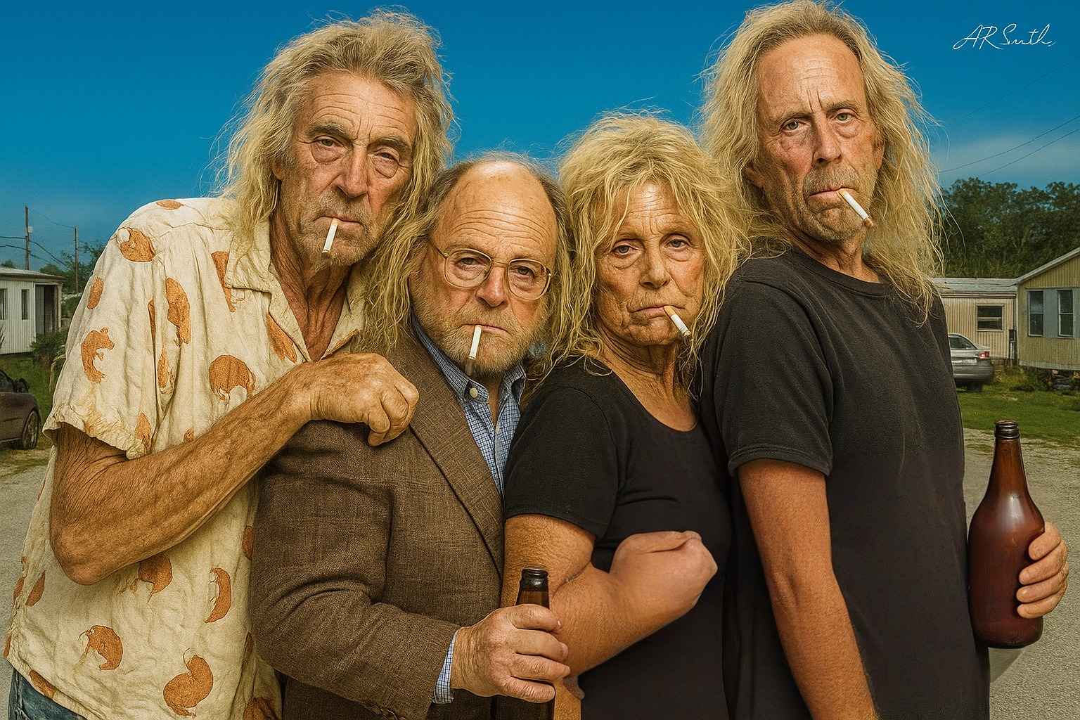 “Seinfeld” once reigned as the quintessential “show about nothing,” turning New York minutiae into cultural phenomena. It thrived on sharp banter, neurotic charm, and absurd obsessions that defined a decade of television. But in this imagined epilogue, the four icons of comedy have traded Manhattan skylines for sagging trailers in a rundown North Florida mobile home park, their wrinkles deep and their clothes scavenged from thrift bins. Cigarettes droop from tired mouths, hands clutching survival trinkets instead of coffee cups, their piercing eyes more haunted than amused. The gators and vermin around them replace soup kitchens and subway rides, every shadow a reminder of decline. What was once urbane wit and endless punchlines is now silence, sagging resilience, and cosmic irony. Today, “Seinfeld” stands less as a timeless comedy than as proof that even shows about nothing eventually end in the starkest kind of something.