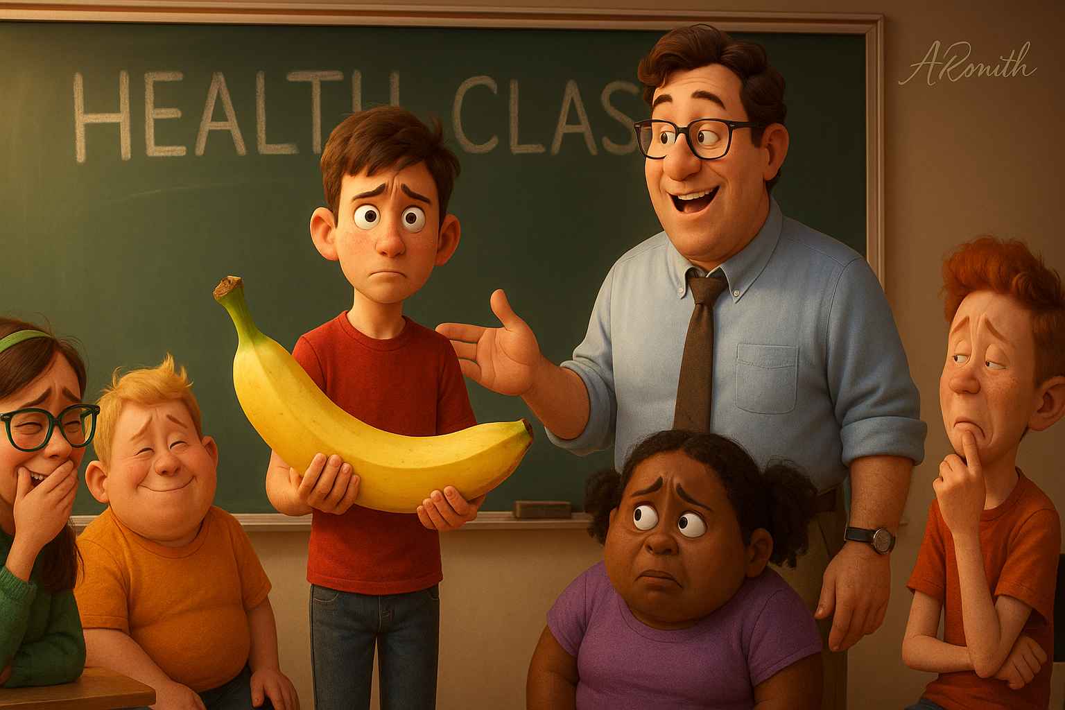 In Health Class, Mr. Dobson was already setting up his props like a magician before a trick: a humongous industrial hose, a flip chart labeled “Responsible Choices,” and a bright yellow banana that looked like it had been genetically engineered just to shame adolescents learning about contraception. He scanned the room with his usual predator calm.