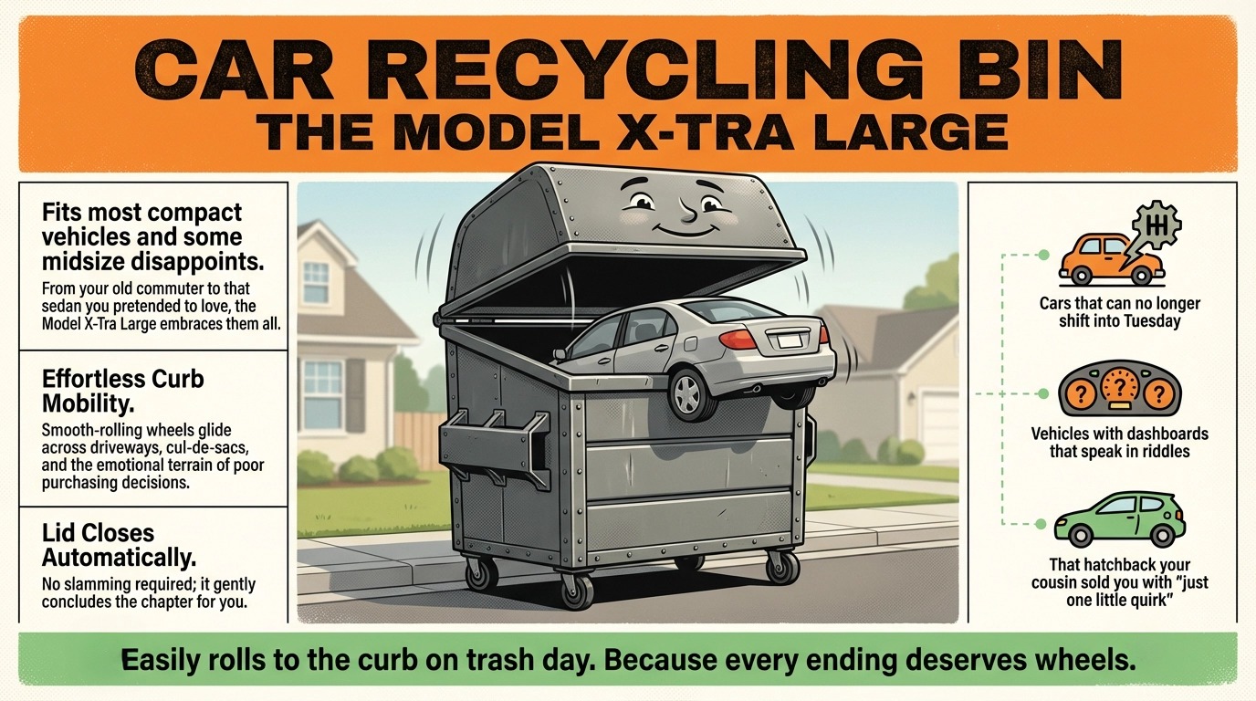 Fits most compact vehicles and some midsize disappointments. Features a cheerful lid that closes with “a sigh of acceptance.” Easily rolls to the curb on trash day.