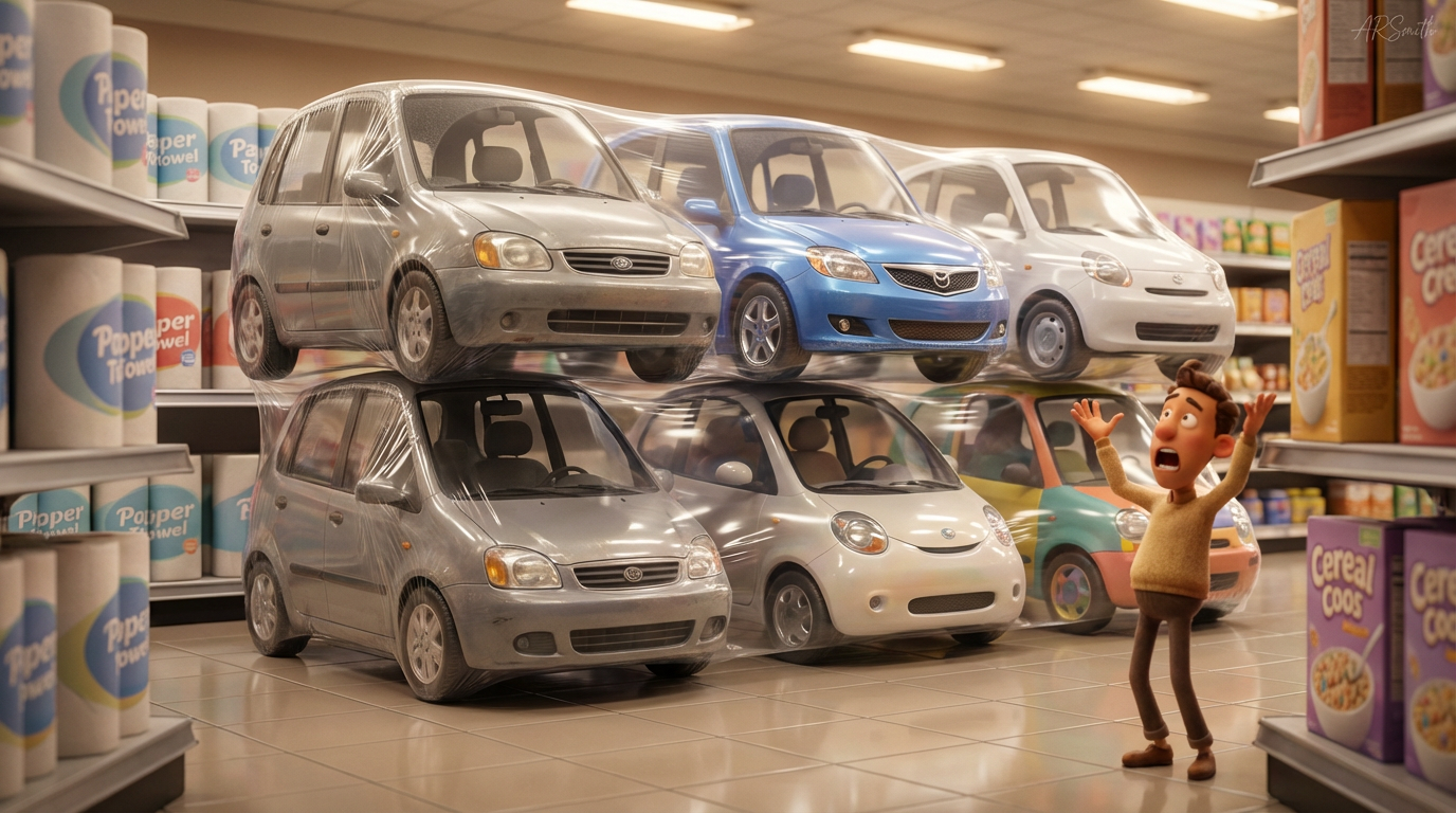 Automakers now offer their finest innovation. Vehicles that are sold in bundles, shrink-wrapped, pantry-stable, and nestled conveniently between the paper towels and cereal boxes at Walmart.