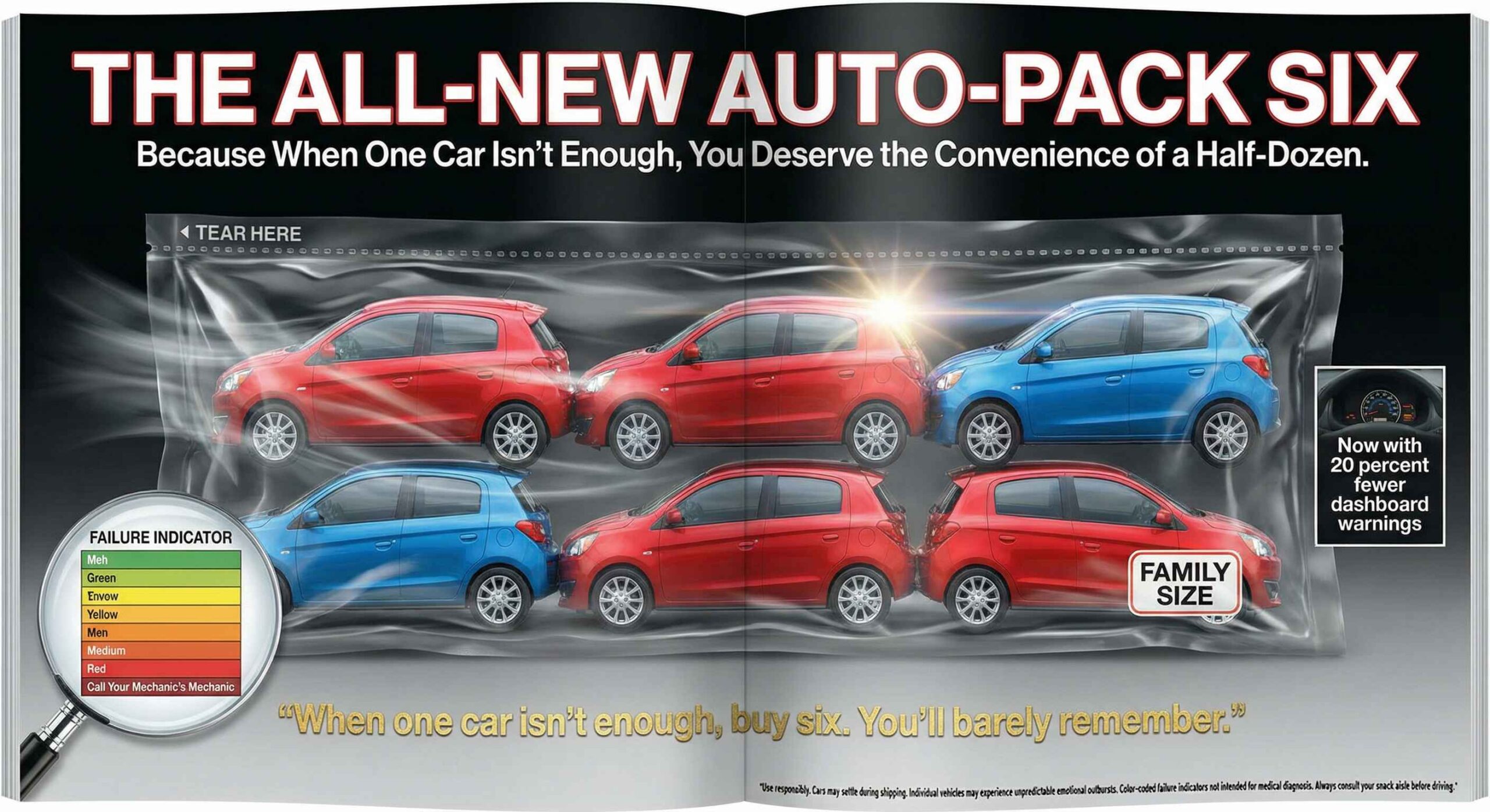 When one car isn’t enough, buy six. You’ll barely remember. Includes easy-tear-open packaging and color-coded failure indicators. Now with 20% fewer dashboard warnings!