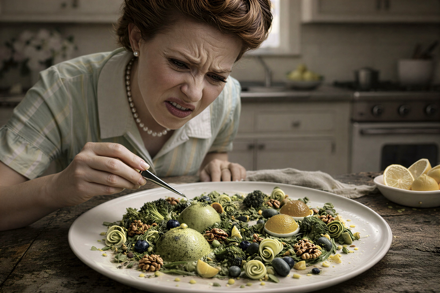 Walnuts are distributed in intentional asymmetry. A slight imbalance keeps the eye engaged while preserving composure. Lemon appears in micro-dots or fine zest gestures—never pooled, never theatrical. Acidity registers in suggestion alone. It reads as cultivated restraint.