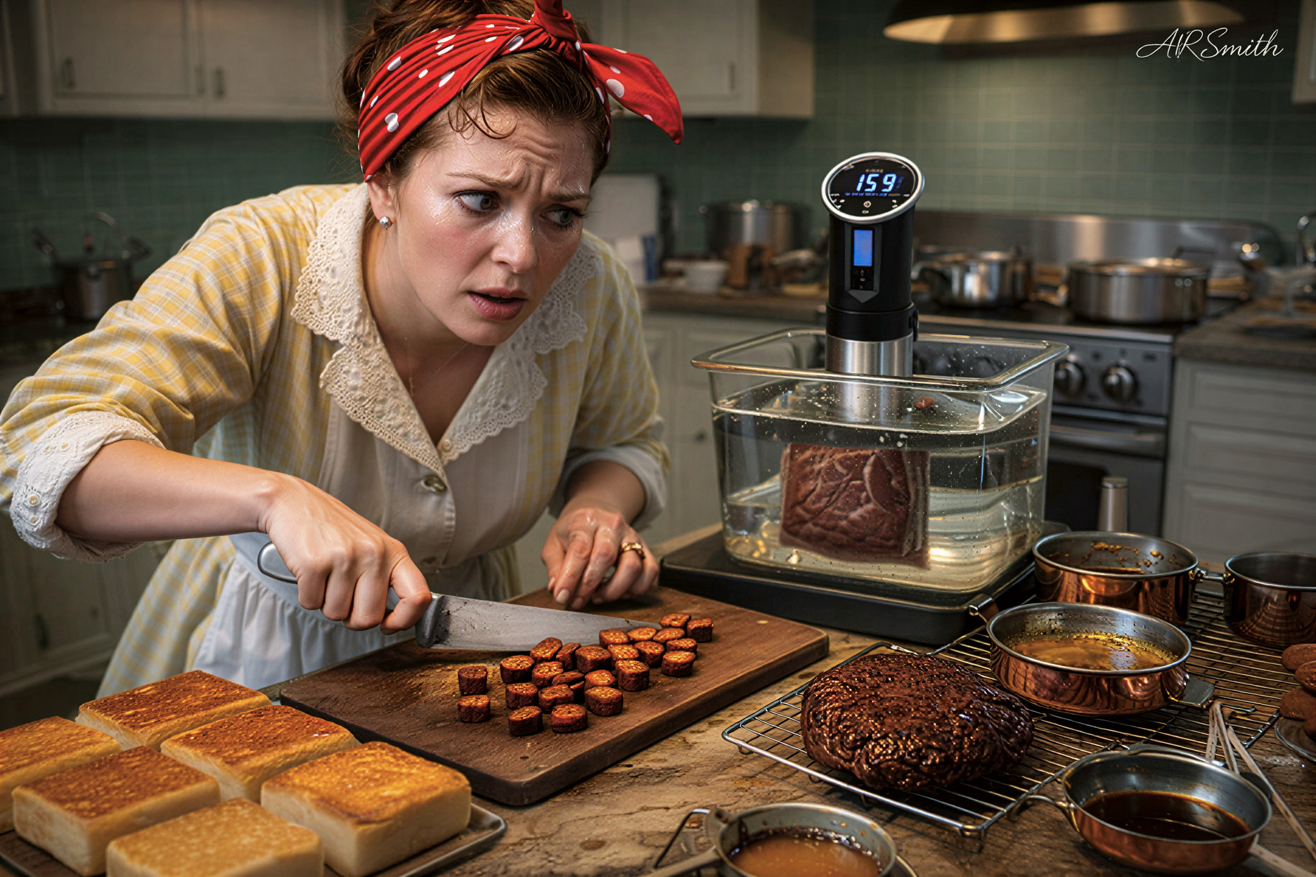 Protein is stabilized before it is dramatized. The patty—recognizable despite being stripped of its identity—is sealed and submerged into a water bath governed to the Nth degree. Heat transfers with mathematical patience. Fibers relax evenly. Fat distributes rather than escapes. Internal temperature rises in a measured ascent, plateauing precisely where tenderness and structure coexist. Only then is it extracted, dried meticulously, and introduced to high heat. The searing is brief and deliberate. Surface sugars and amino acids engage in a controlled Maillard reaction, forming a lacquered crust that reads bronze under light. The exterior gleams. The interior remains measured and pink.