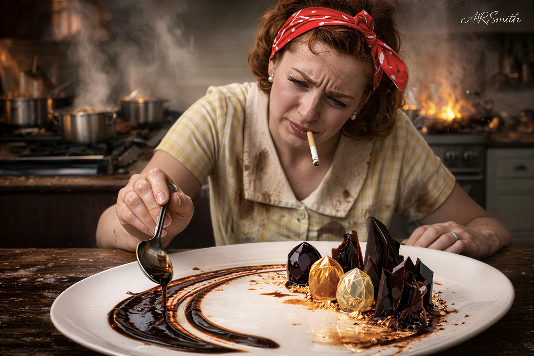 Chocolate shards punctuate the field. They rise cleanly from the plate, angled so reflections shift as the diner moves. Their placement feels architectural rather than decorative. The soda Gastrique is carefully brushed in a crescent motion. The stroke begins dense, then thins gracefully, fading at its terminus. It suggests movement rather than sweetness.