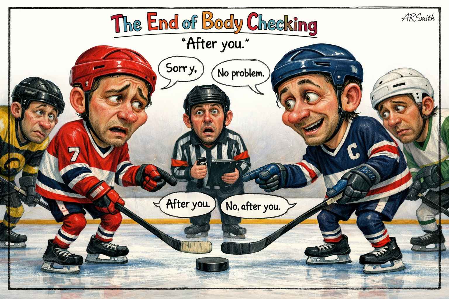 Defensemen who once built careers flattening opposing forwards now skate beside them like courteous escorts. Sometimes two players arrive shoulder to shoulder and instinctively drift apart.