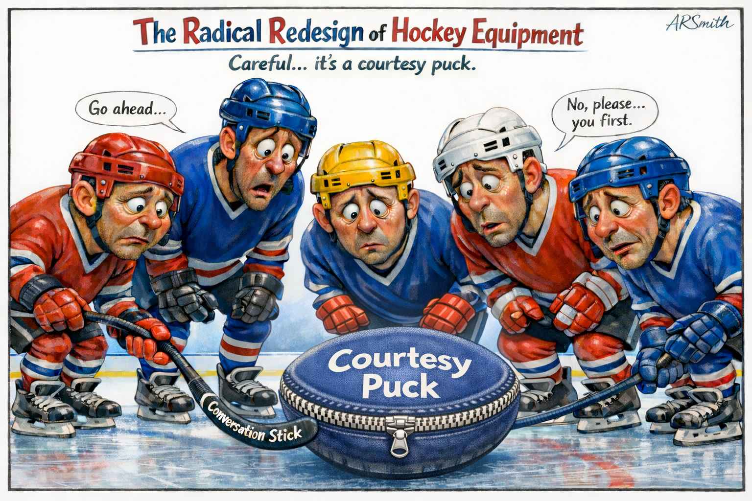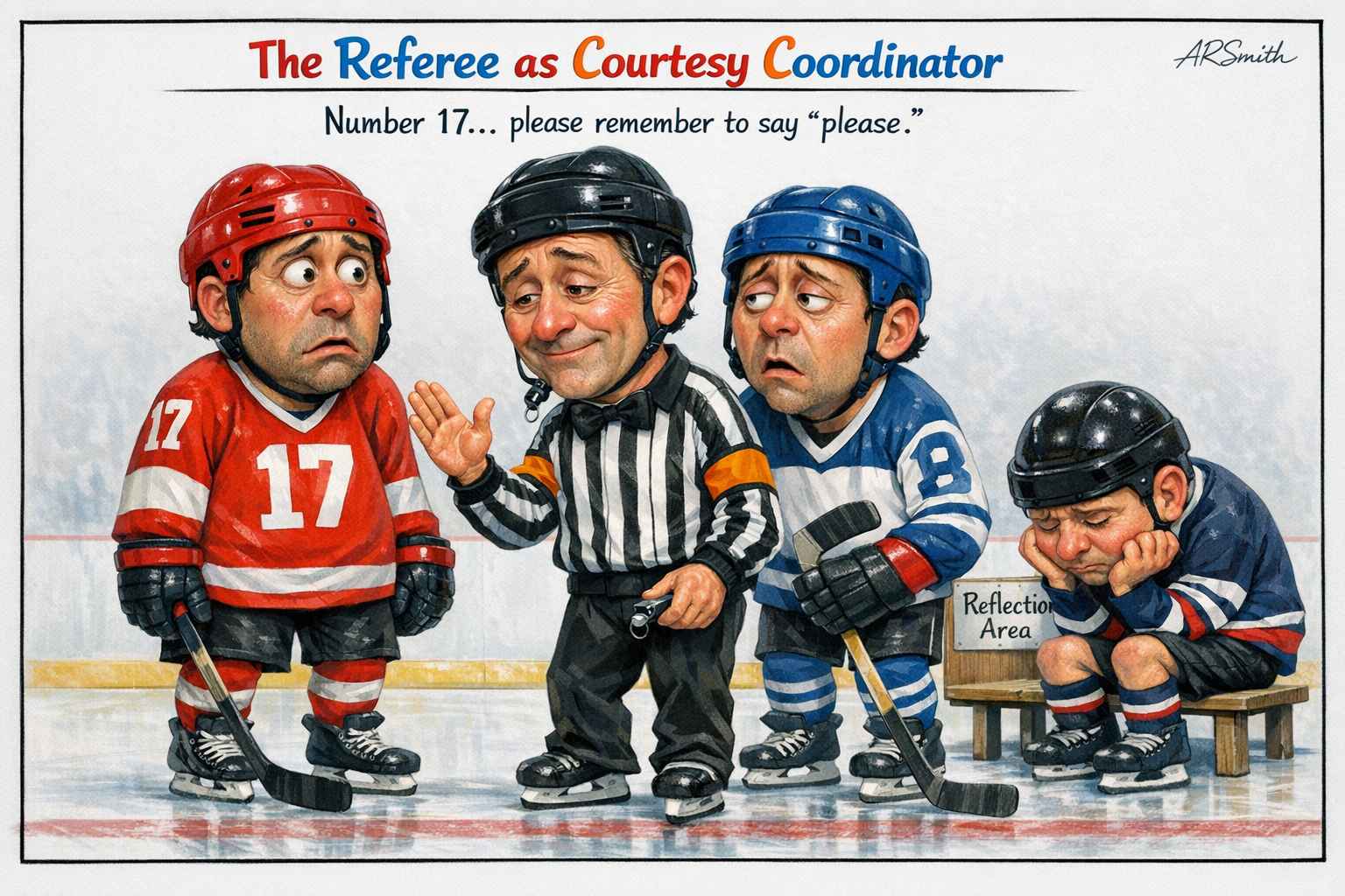 Minor penalties now include such infractions as Excessive Competitive Urgency, Failure to Acknowledge a Polite Request, and Passive-Aggressive Skating. Players who commit these offenses are escorted to what used to be called the penalty box. It is now known as the Reflection Area, where they sit quietly for two minutes, contemplating their tone.