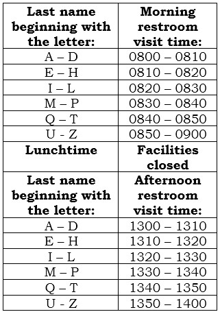 After a thorough review of productivity reports, water usage, and hallway linoleum wear, I’ve been made aware of the flagrant use of our corporate restrooms and that immediate corrective measures are required.