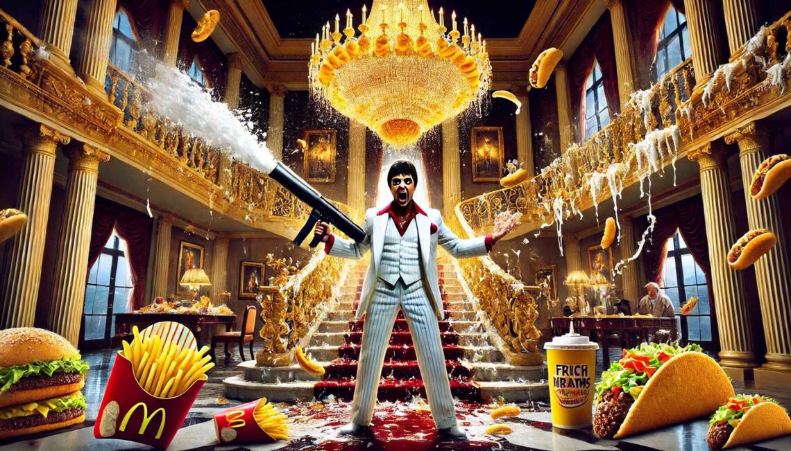 Original Premise: Scarface (1983) – “Say Hello to My Little Friend!” Tony Montana, armed with a grenade-launching rifle, takes on an army of assassins in an explosive, over-the-top final stand that became an instant classic. Opening Scene Tony Montana stands at the top of his grand staircase, sweat glistening under the chandelier made out of old taco shells. Behind him,…