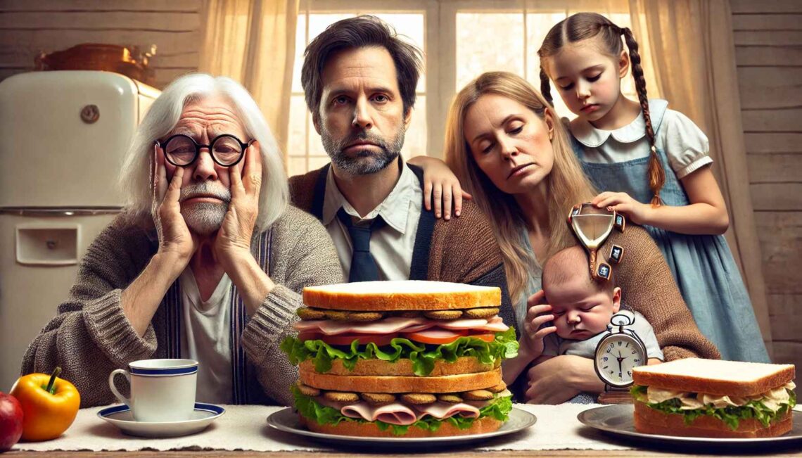 The Sammich Generation. So named for its resemblance to a particularly harrowing club Sammich, invented by Sir Percival Sammich during the Mughal Dynasty’s turbulent period of the 14th century. This generation, trapped between the relentless weight of aging parents and the sheer monotony of raising children, finds themselves hopelessly confined to a life akin to an open-faced Reuben on day-old…