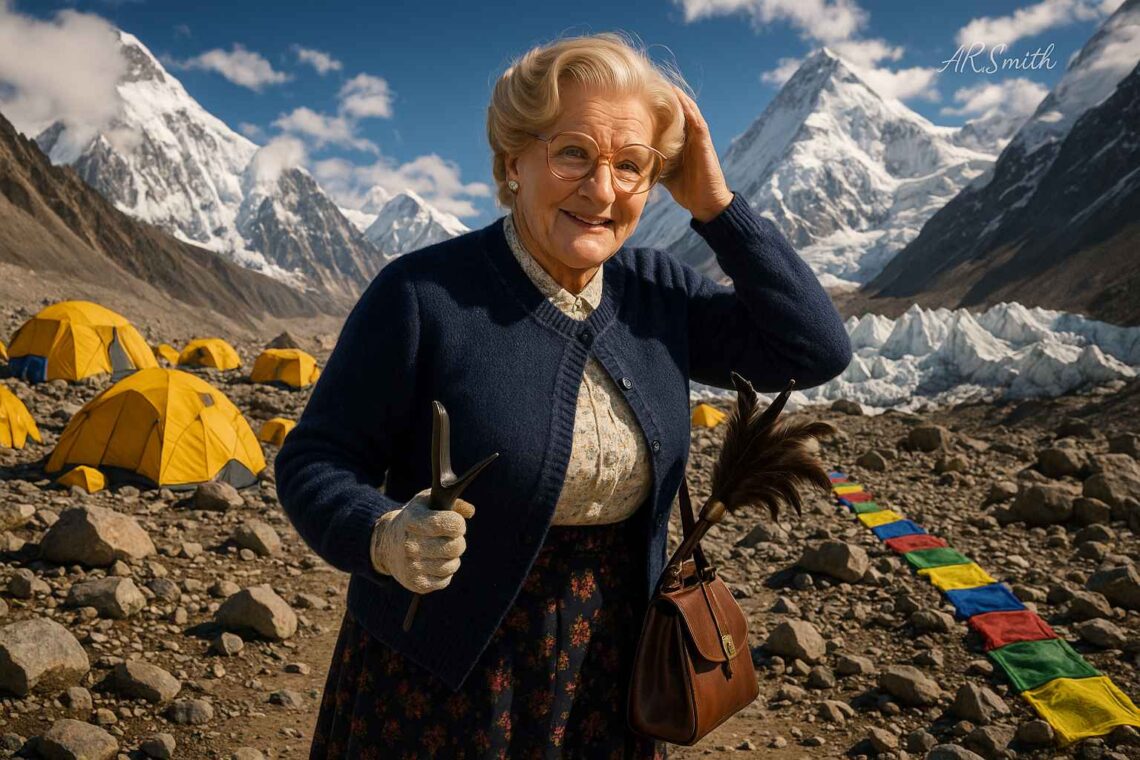 The storm whipped across the ridge like a runaway hairdryer, avalanches pounded like rolling pins on marble, and oxygen dwindled into whispers. Yet there she was—Mrs. Doubtfire—teetering in stiletto heels, floral handbag flapping, makeup smudging under the frost, climbing into legend at 29,032 feet. She arrived at base camp as an over-50, logistically overwhelmed, overweight first-time climber plagued by shaky…