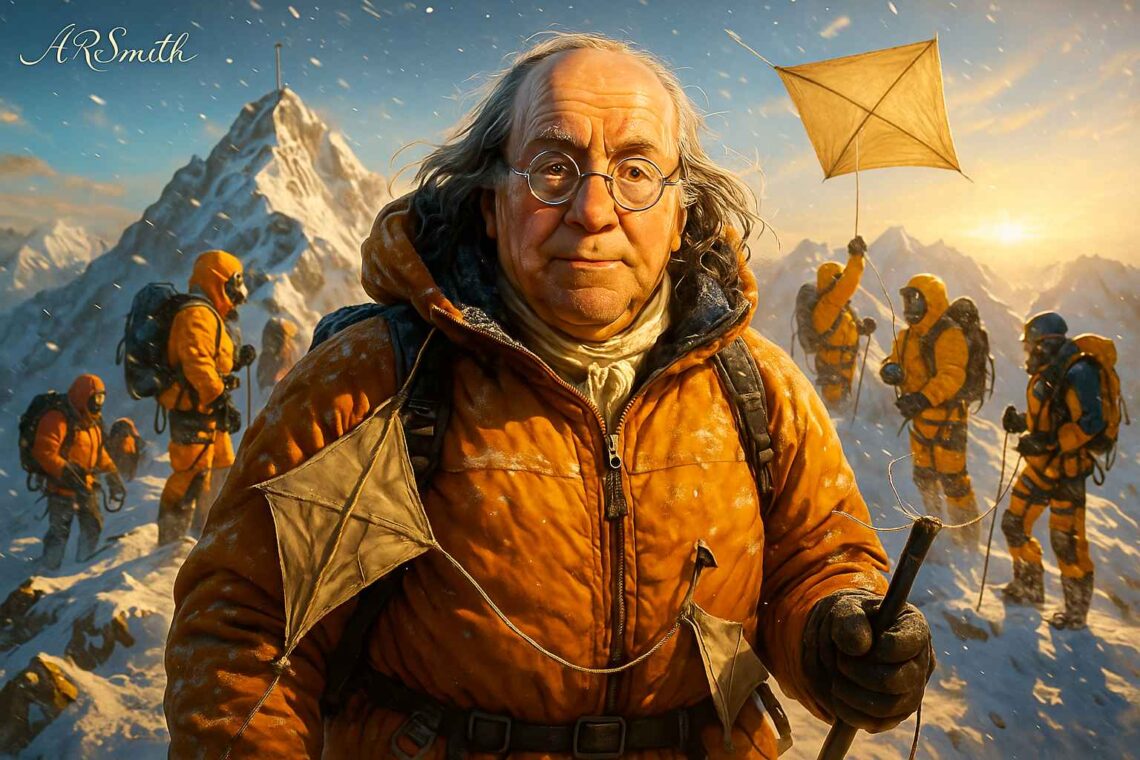 The Himalayas howled with winds topping 80 mph, avalanches thundered in the distance, and yet Benjamin Franklin—at over 70, habitually disorganized, vision corrected, and prone to shaky knees—marched into Everest’s death zone like he was chasing another thunderbolt across the sky. He didn’t just carry crampons. He lugged bifocals, a kite, and a restless wit, determined to inscribe his name…