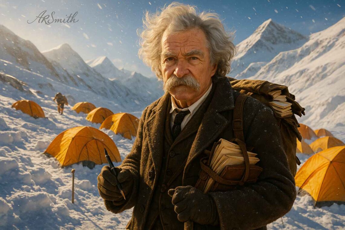 Mt. Everest roared with hurricane winds and snow that cut like glass, but Mark Twain—well over 70, habitually disorganized, untrained, and dogged by indigestion—pressed into the thin-air crucible with the grin of a man chasing metaphors higher than clouds. His mustache froze into white icicles, his wit never dimmed, and the mountain had no defense against his stubborn narrative. At…